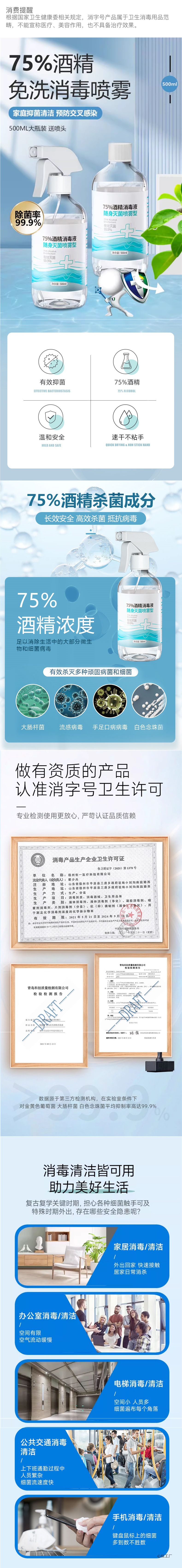 Дезинфицирующий спирт 75 градусов 500 мл, большая бутылка, дезинфекционный спрей, без мытья, 75% спирт