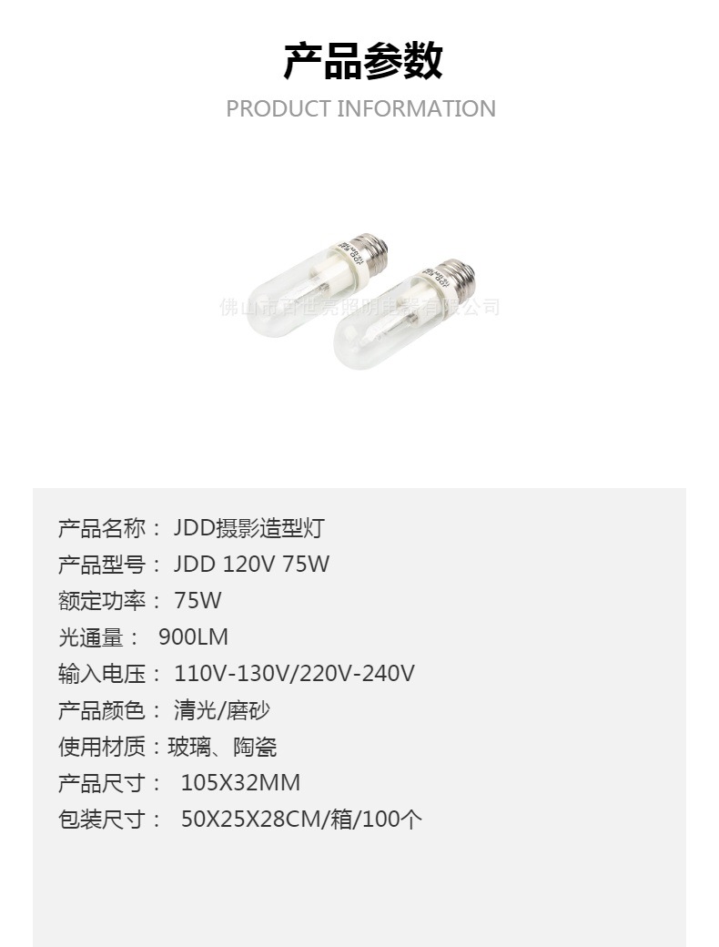 我司JDD卤素灯泡具有高显色、高光通量等特点,是摄影造型灯的优选器材。可选瓦数:75W、100W、150W、250W。可选灯头:E26、E27。