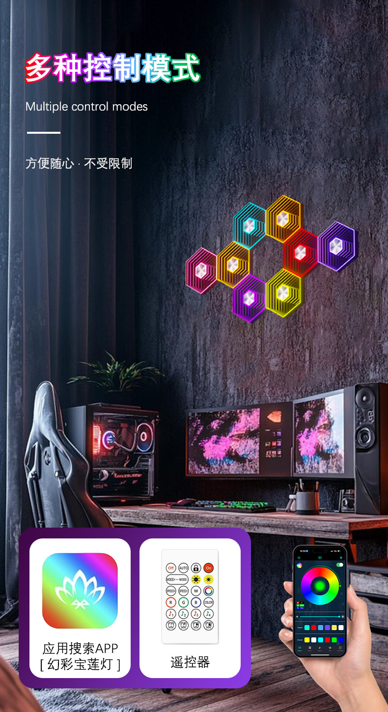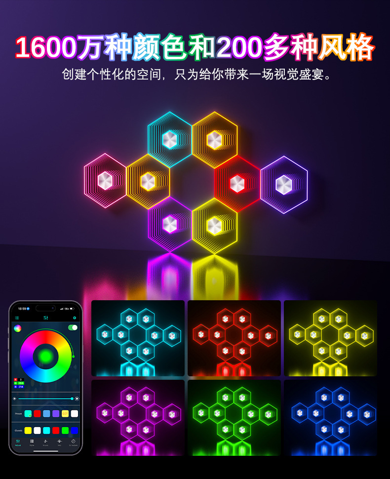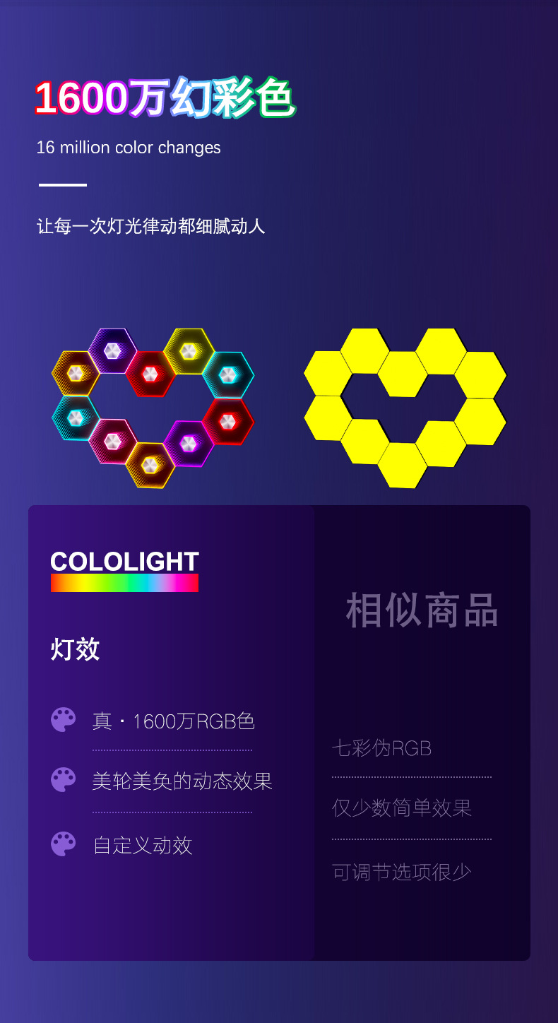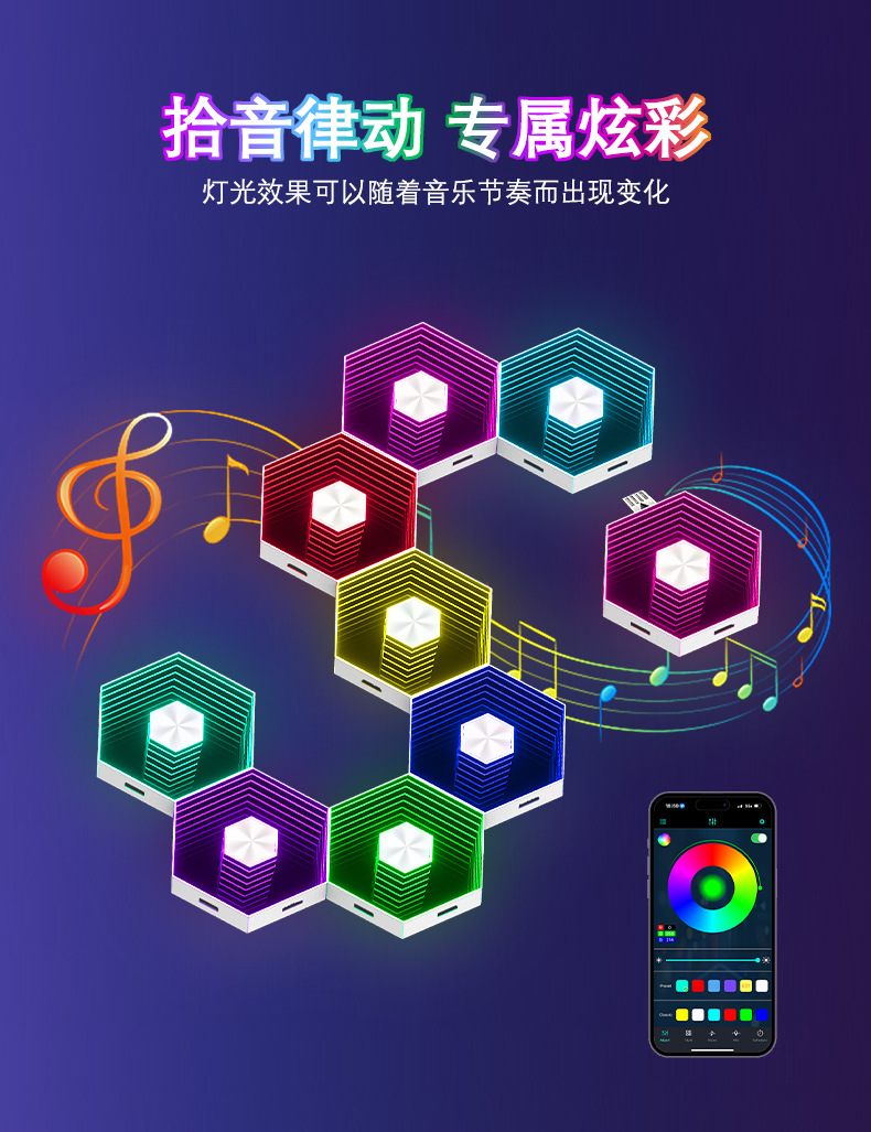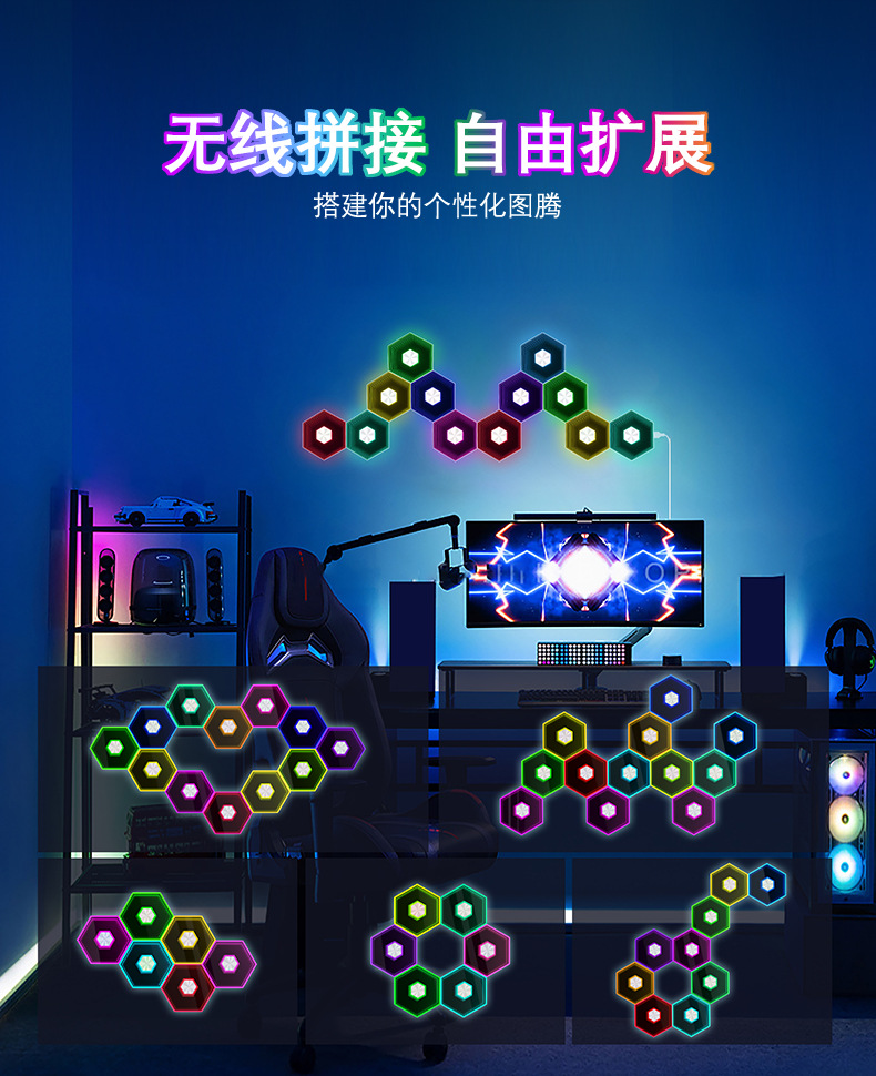 产品功能:1、自由拼接 2、拾音律动 3、1600万色彩变换 4、氛围装饰 5、多种控制模式