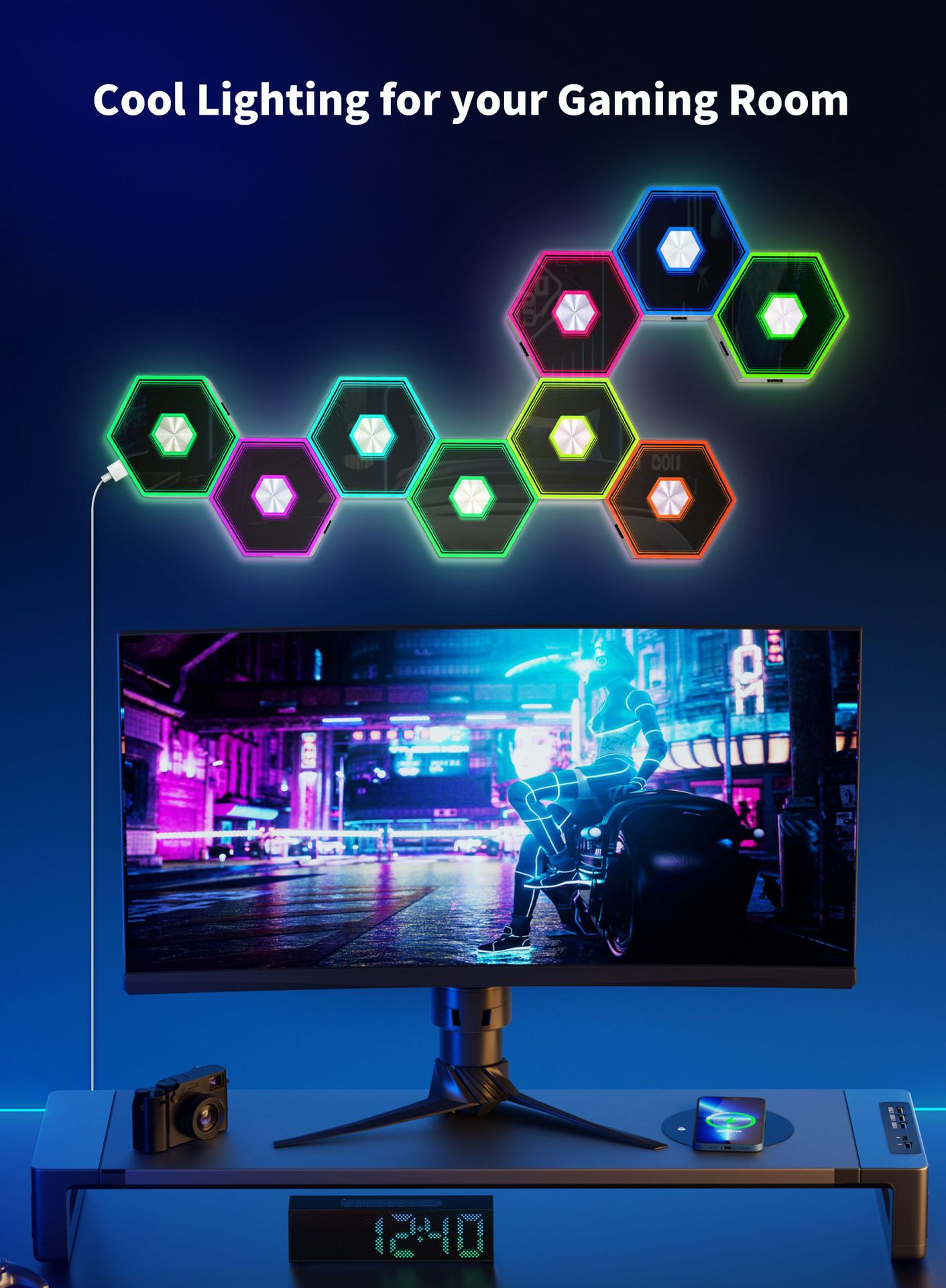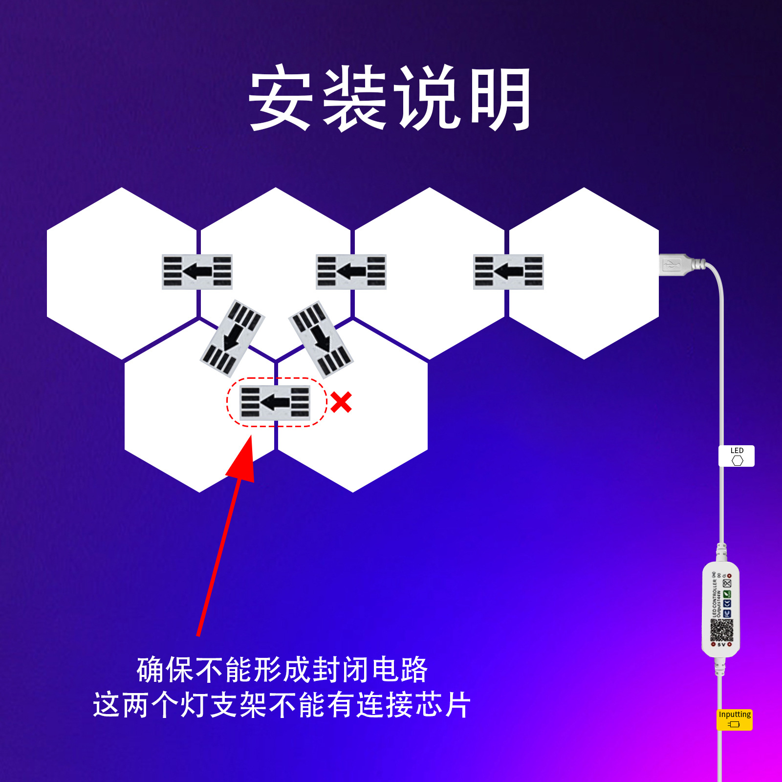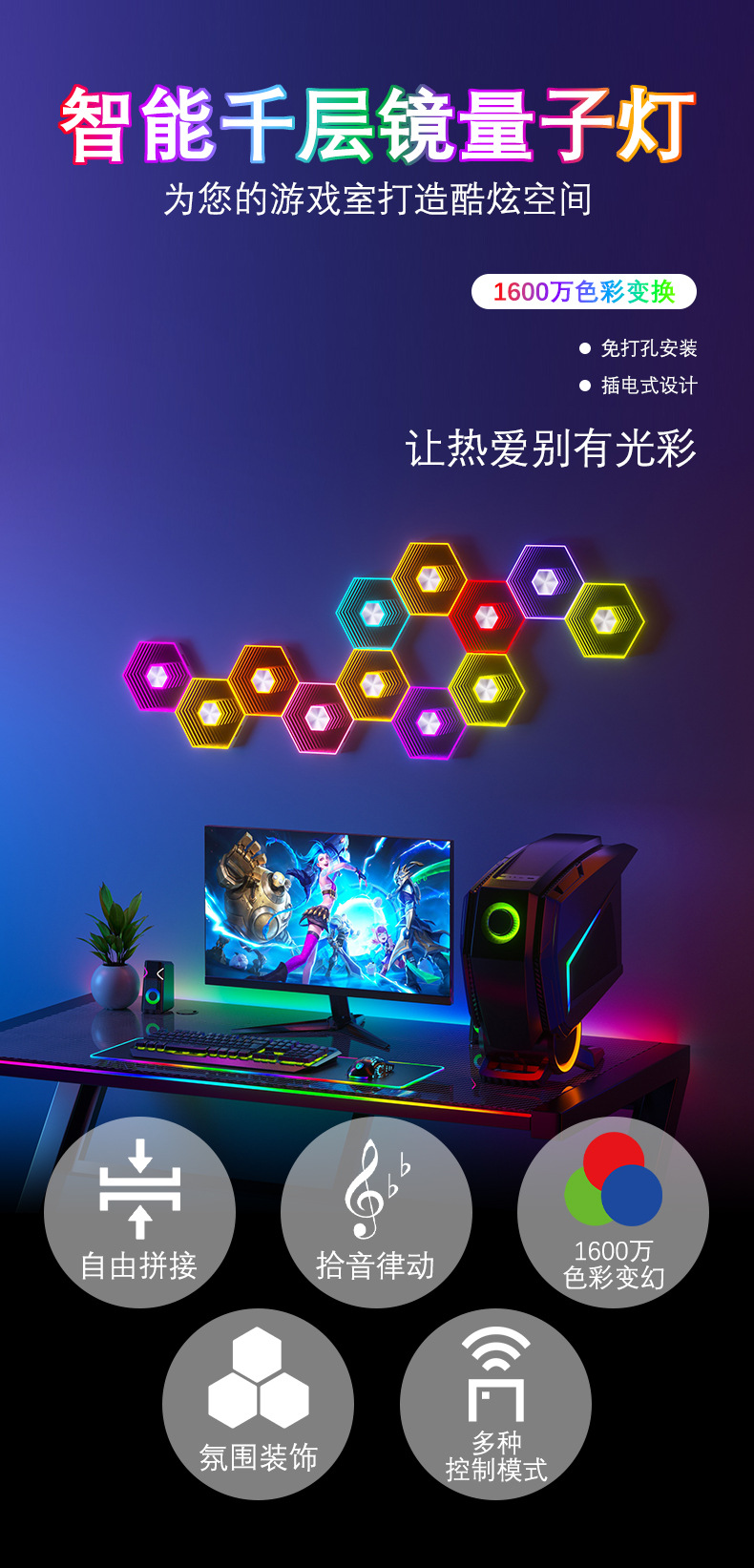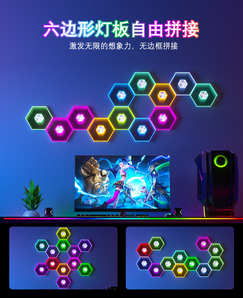 产品功能:1、自由拼接 2、拾音律动 3、1600万色彩变换 4、氛围装饰 5、多种控制模式