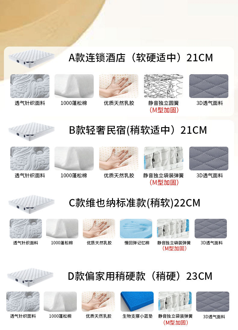 ![]() | Type c vienna standard (slightly softer) 22cm: skin-friendly fabric + latex + memory foam + m reinforced independent pocket spring | 1800*2000mm | ¥1040.0 / ≈ 12 650 ₽ | 999 | 6035675330099 | |