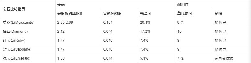 莫桑石:又叫莫桑钻,是由碳化硅石合成,其硬度是9.25,折射率在2.65-2.69左右,具有与钻石相同的金刚光泽,火彩更强,比以往任何的仿制品更接近钻石。