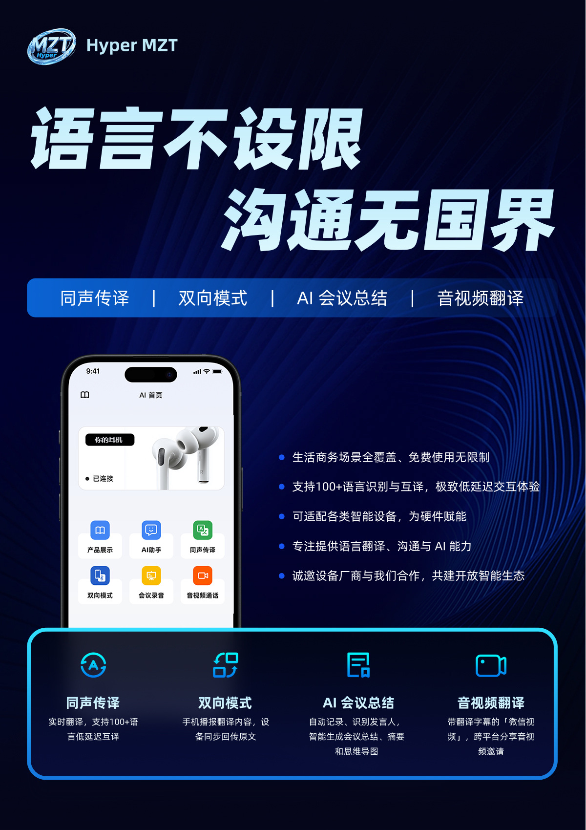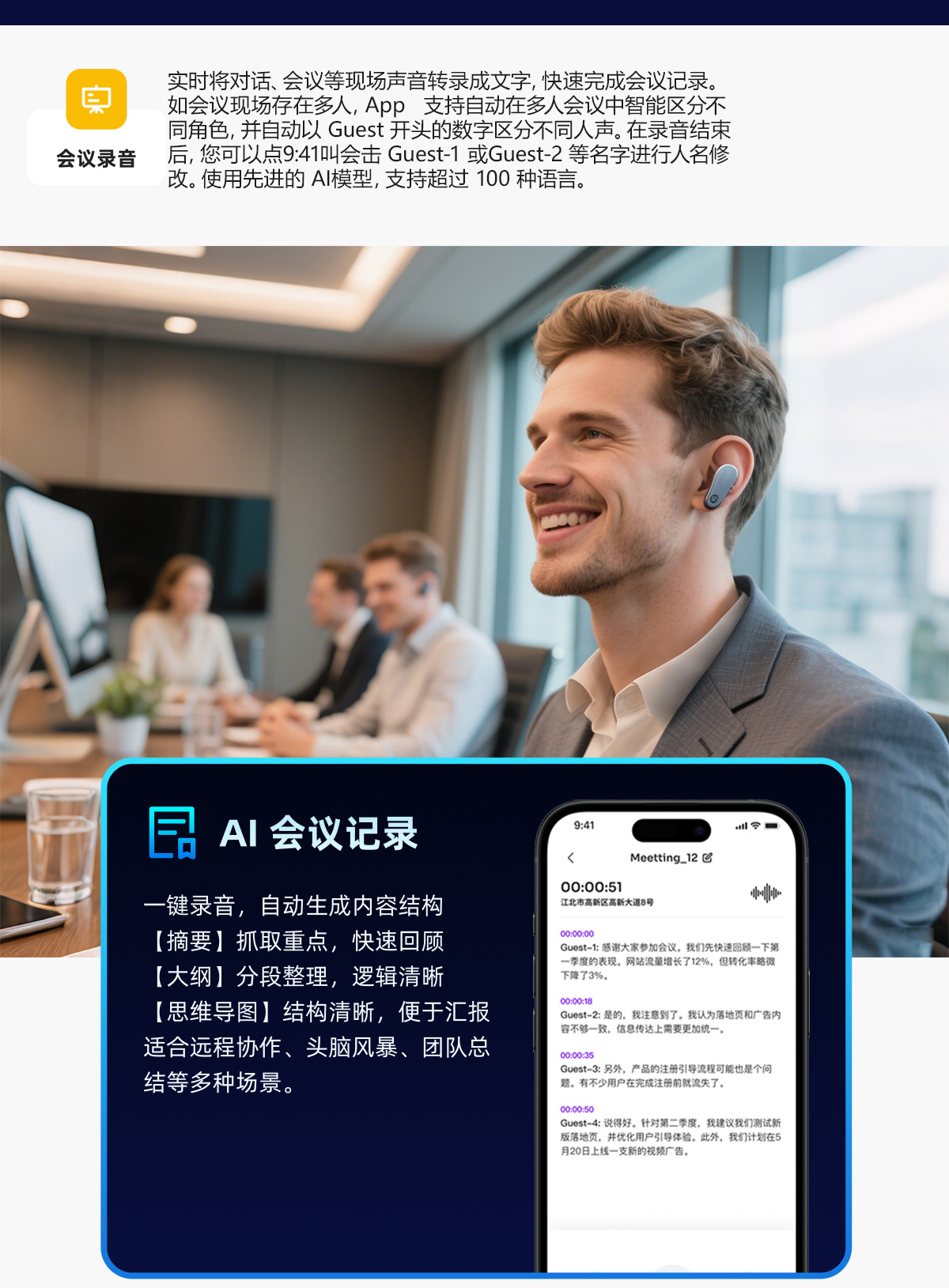 AI Bluetooth очки переводчик, Bluetooth гарнитура, переводчик с одновременным переводом, аудио и видеозвонки, записи встреч