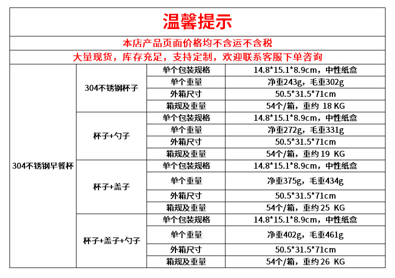 ![]() | 304 stainless steel cup + spoon | ¥26.5 / ≈ 322 ₽ | 9999 | 6020601750274 | |