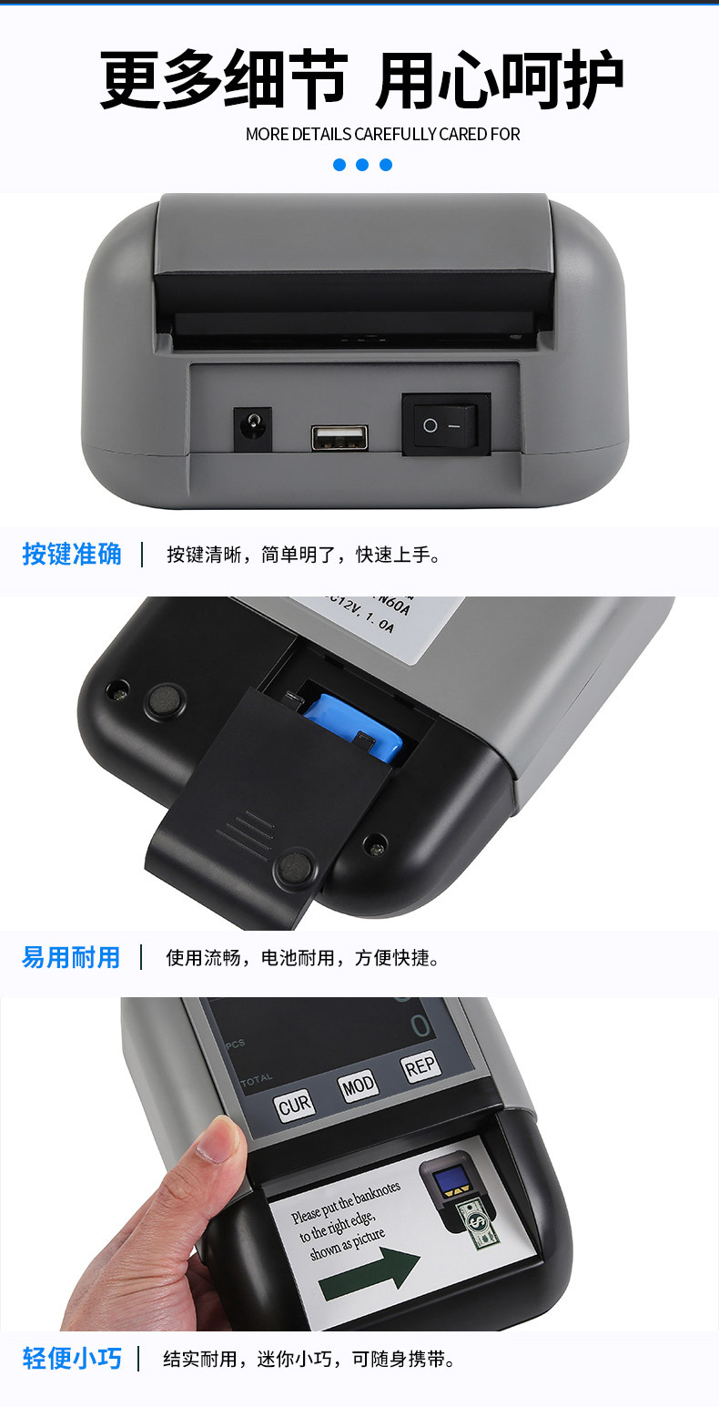 Маленький портативный детектор банкнот долларов, евро и юаней с возможностью установки литиевого аккумулятора для проверки подлинности банкнот
