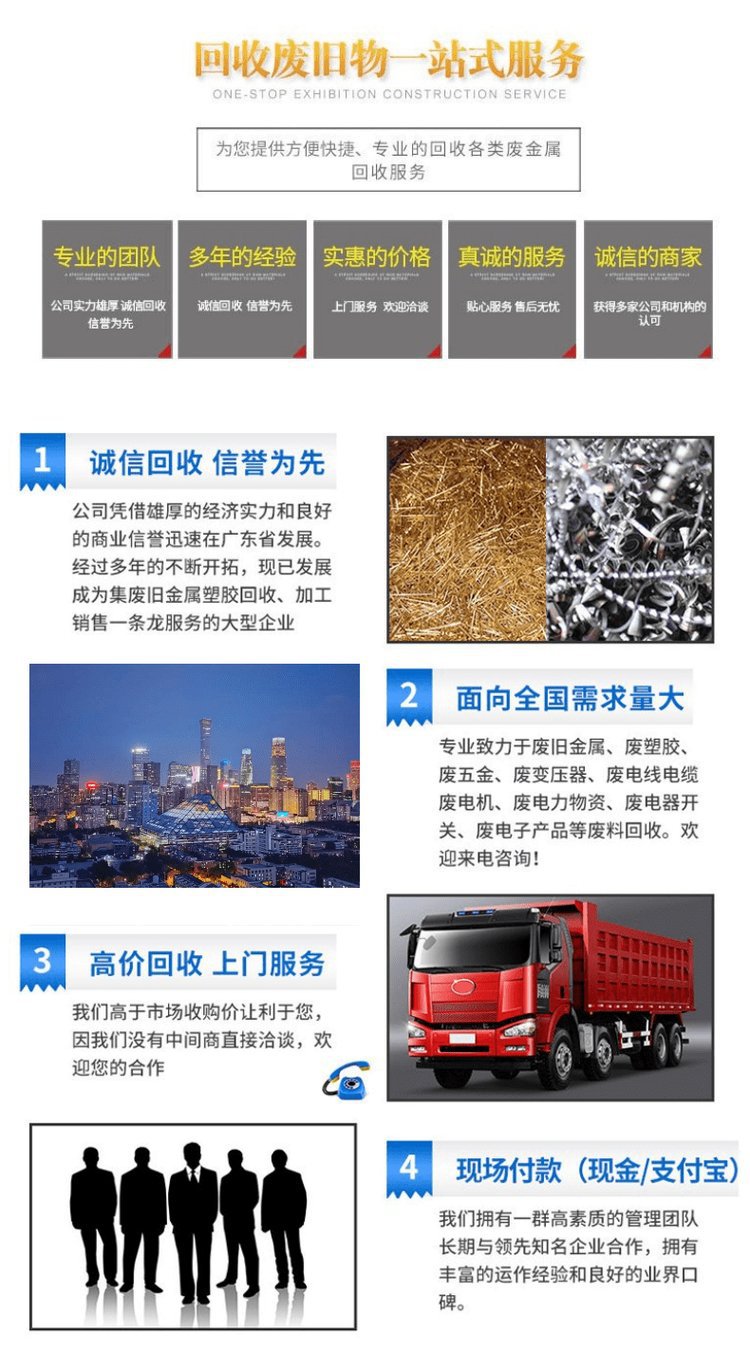 本公司承接回收各种废铁、钢铁、铜、铝、电线电缆、电机、电瓶、空调、制冷机组、电子元件、仪器设备、塑料、机床、废旧物资、医药设备、食品设备、饮料设备、化工设备、电脑、线路板等等,可提供上门服务,量大从优。 各类废品,精准报价。我们有专业队伍上门施工作业,持证上岗,合理交易,快捷。我们从企业单位的需求出发,试通过本网络平台的建立整合物资市场,使可资源合理的流通和科学的再利用。
