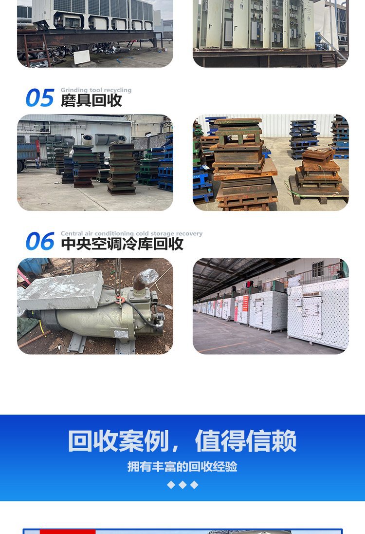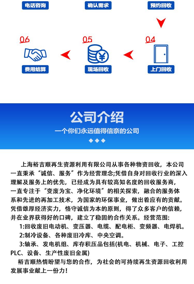 三、废旧废钢回收:电动机,发电机组、废旧变压器,配电柜,中央空调、机床、锅炉等废旧产品。