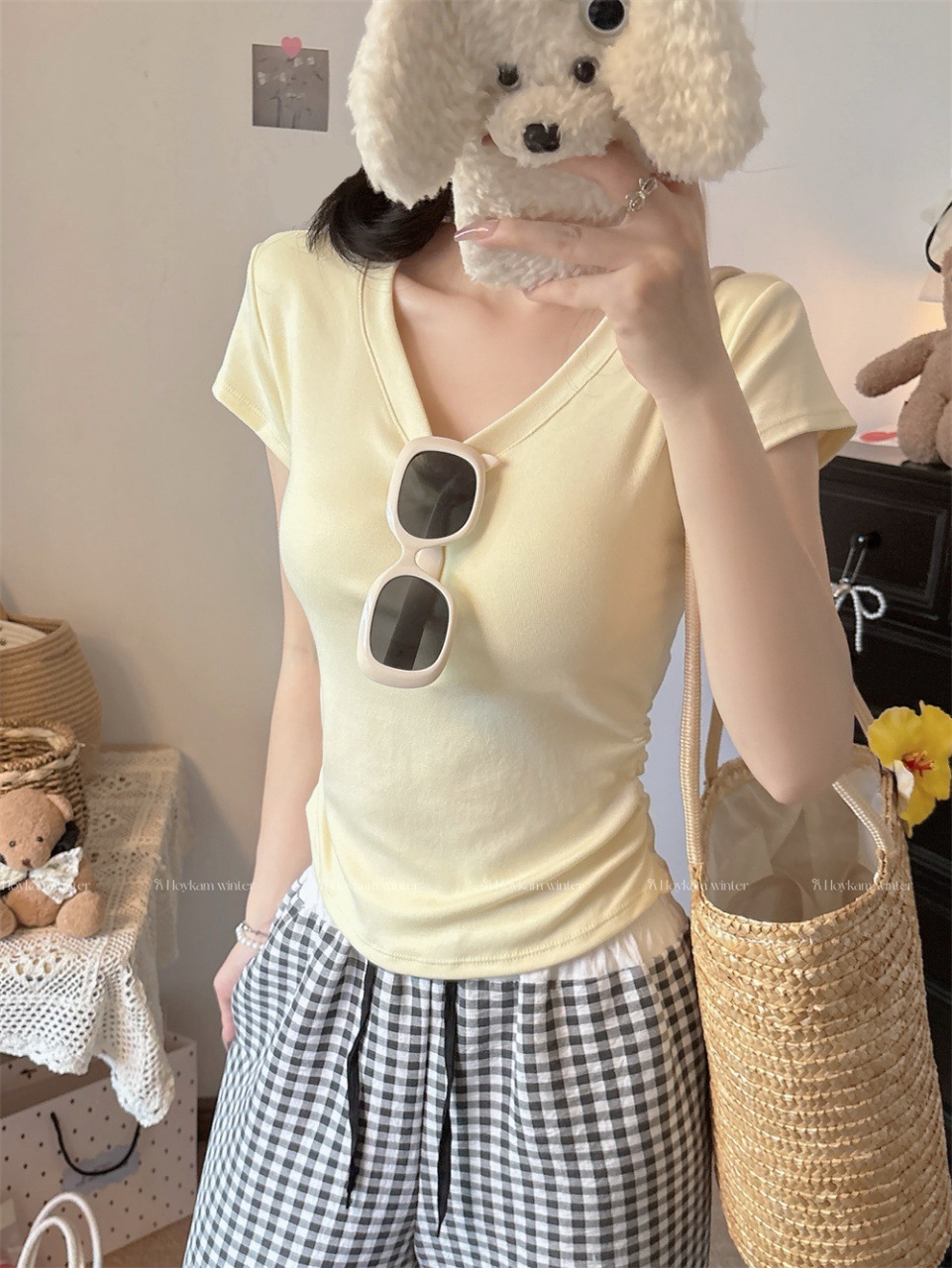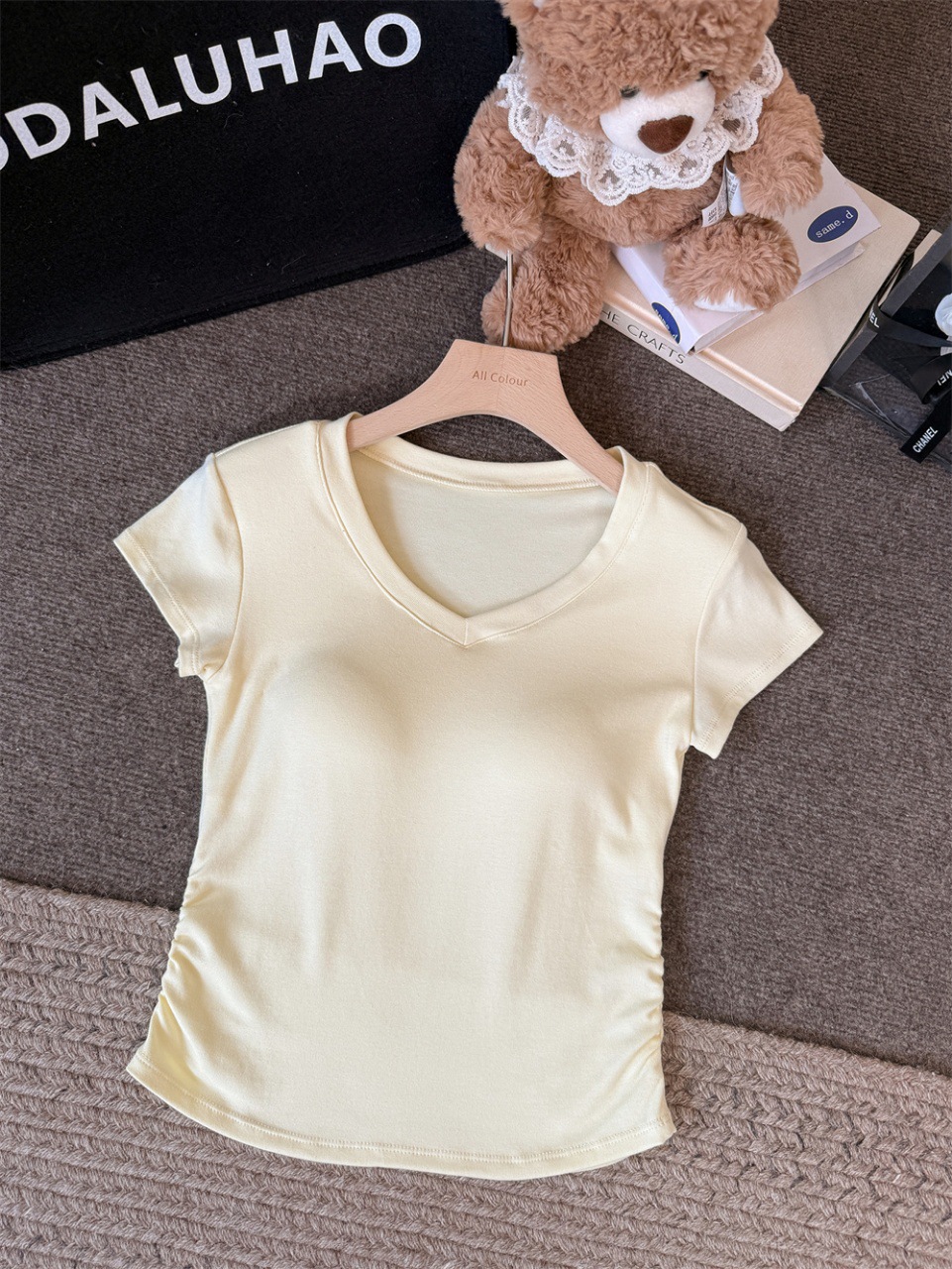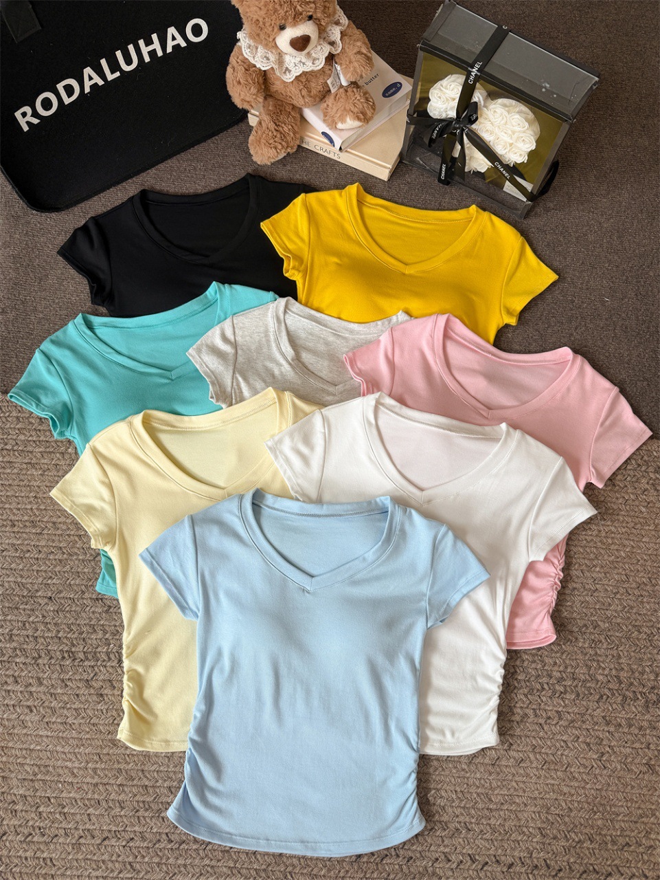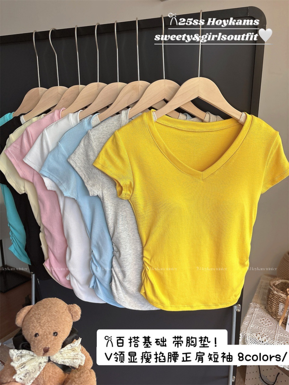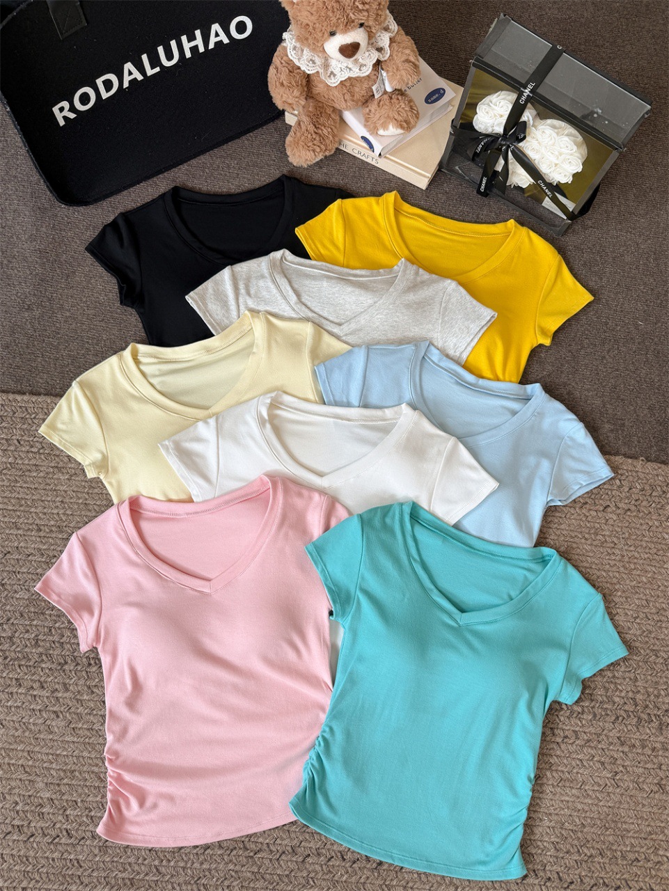 5125 # Чистое желание, V-образный вырез, правое плечо, короткий рукав, футболка для женщин, летний утягивающий дизайн, рюши на талии