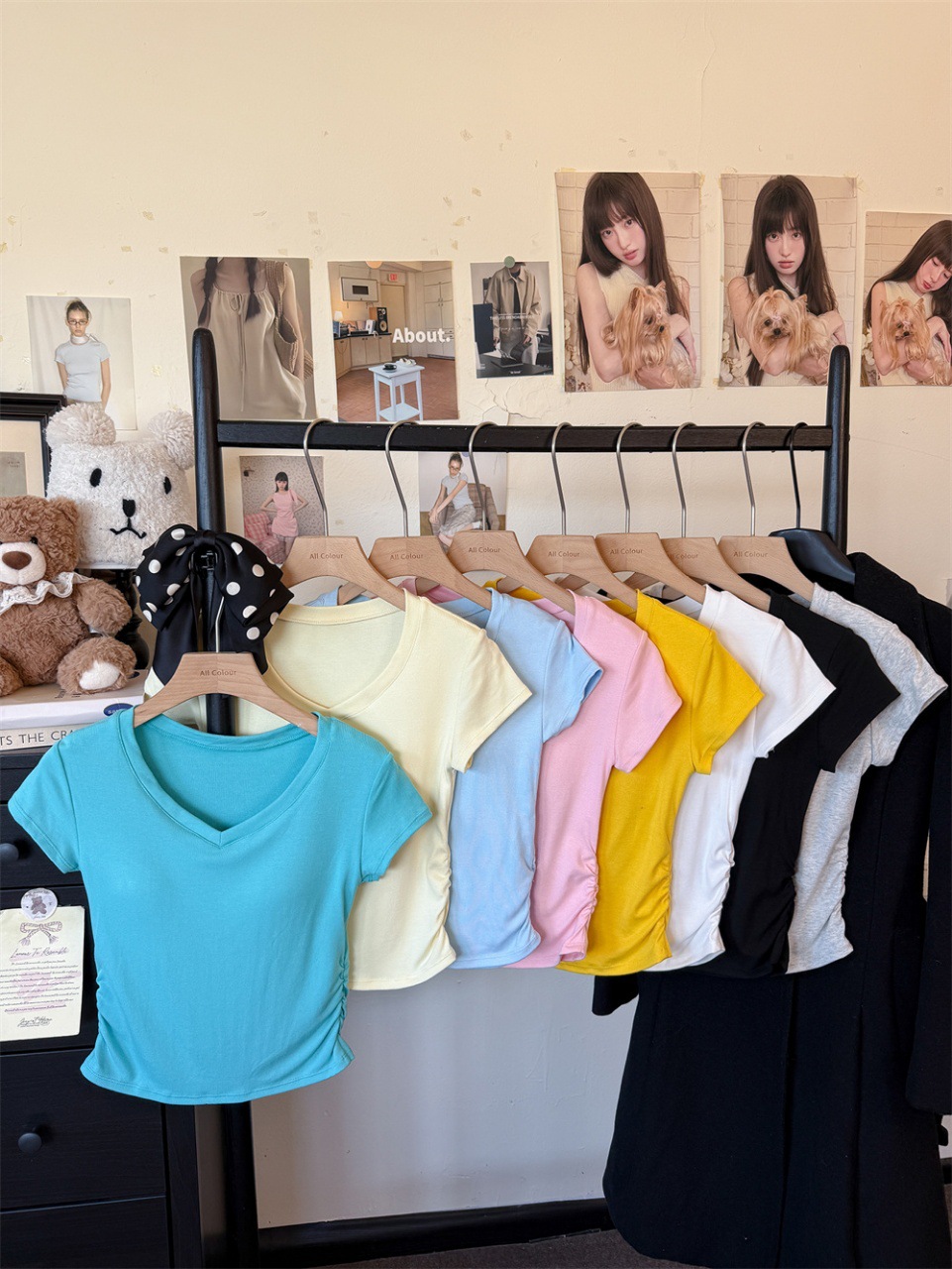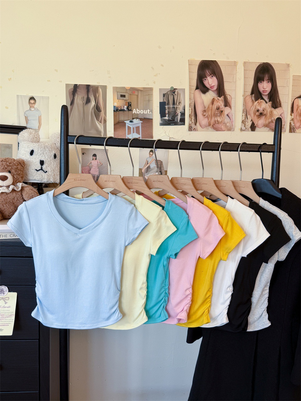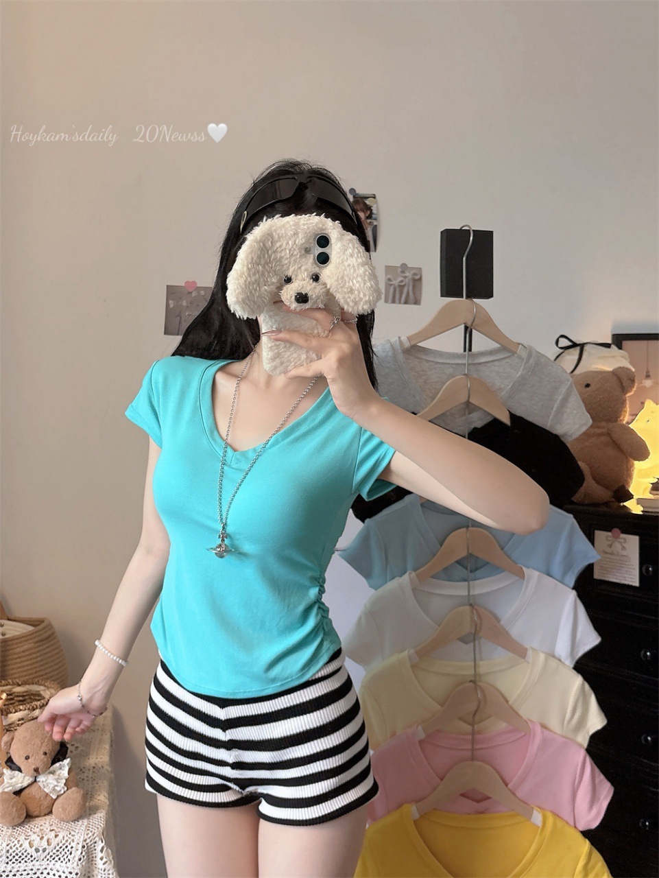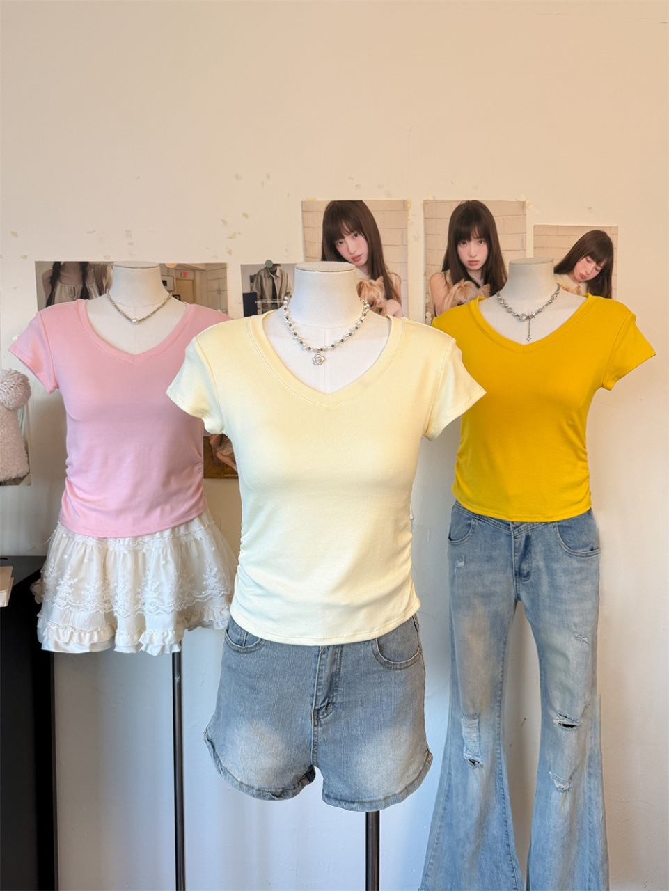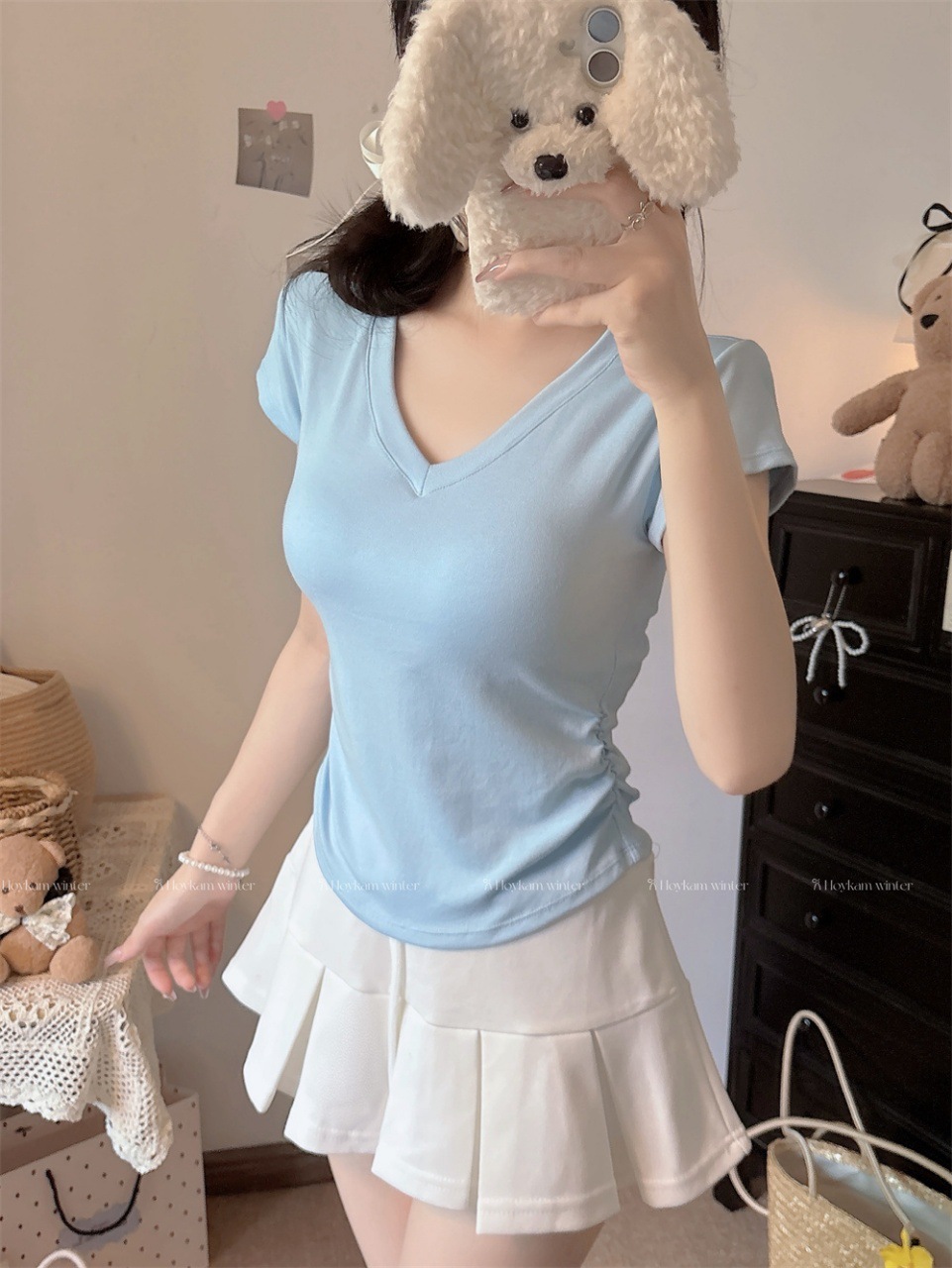 5125 # Чистое желание, V-образный вырез, правое плечо, короткий рукав, футболка для женщин, летний утягивающий дизайн, рюши на талии