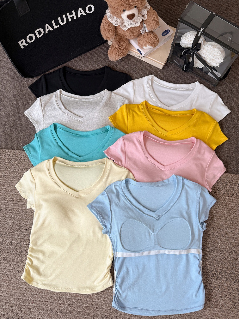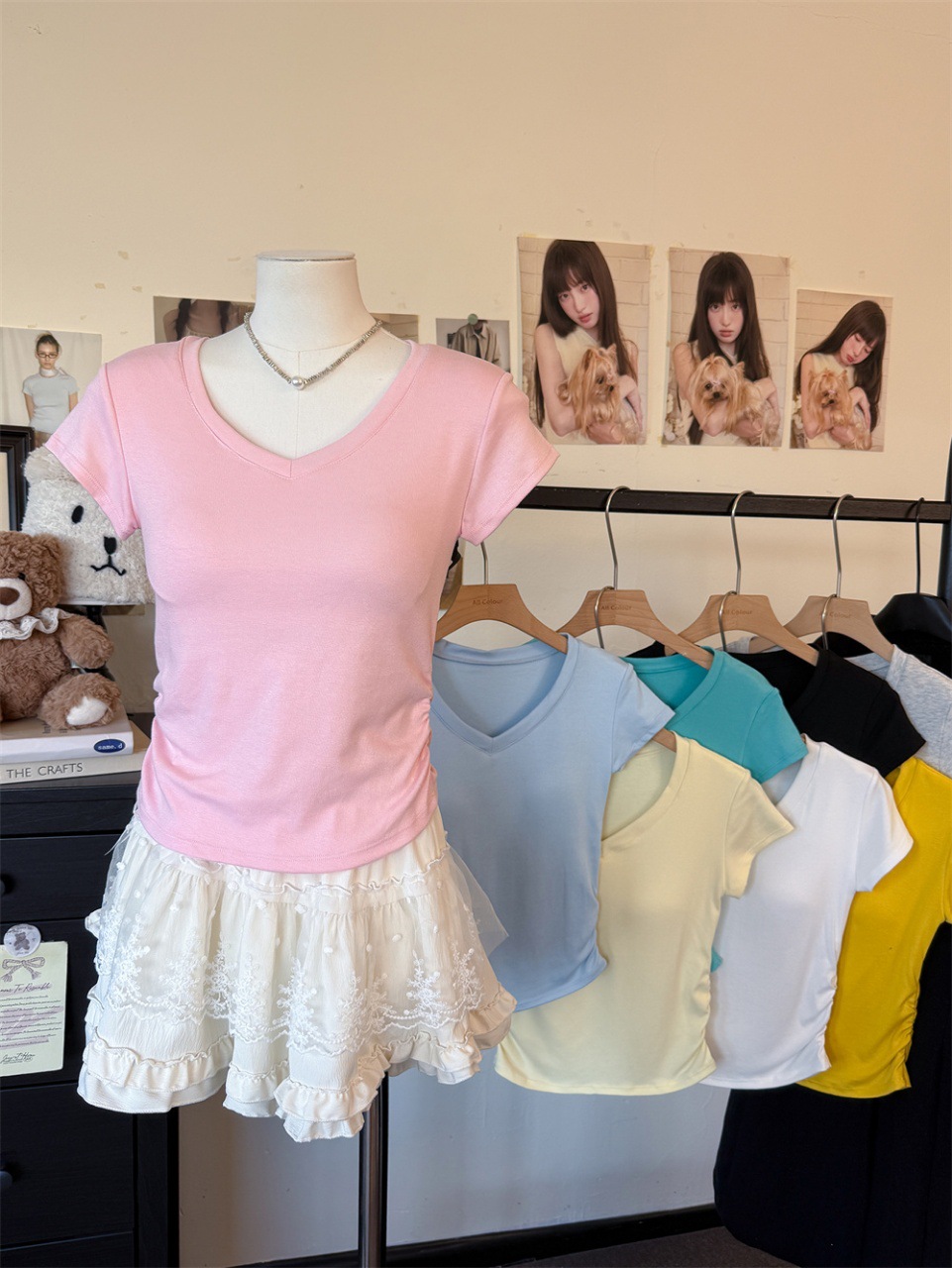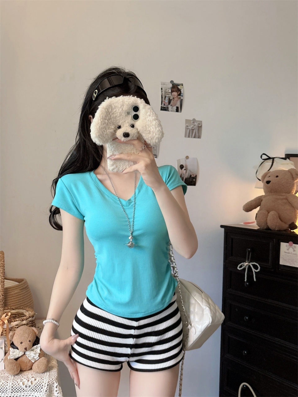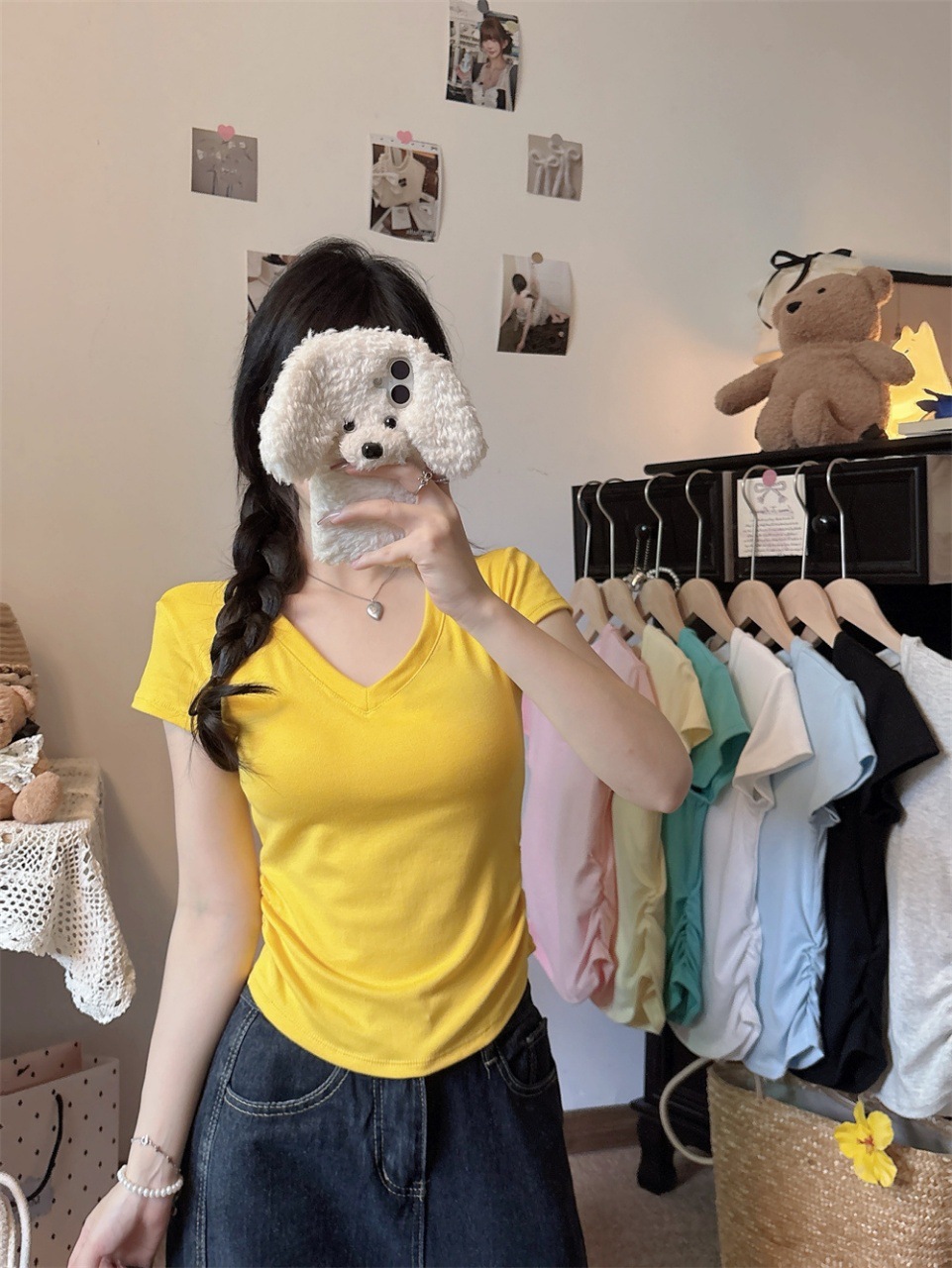 5125 # Чистое желание, V-образный вырез, правое плечо, короткий рукав, футболка для женщин, летний утягивающий дизайн, рюши на талии