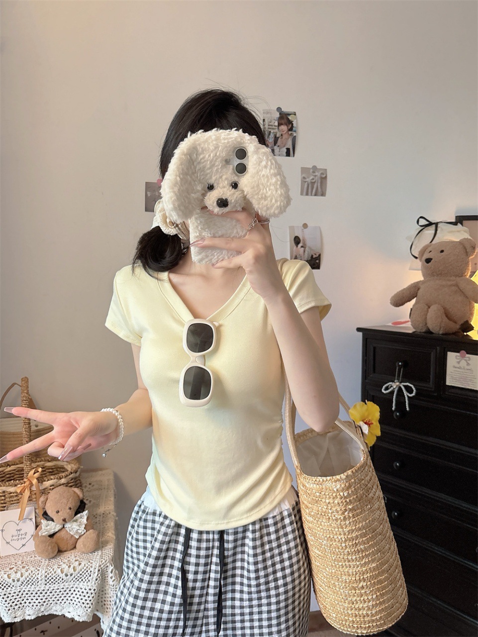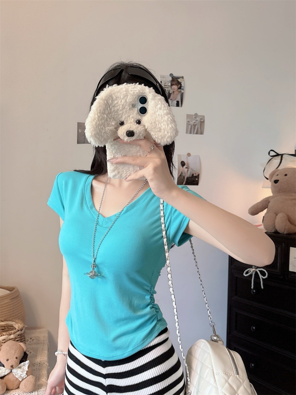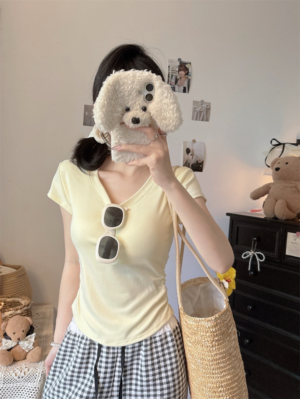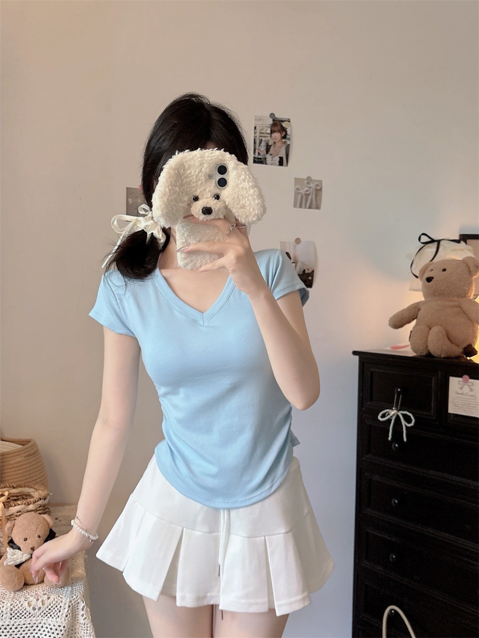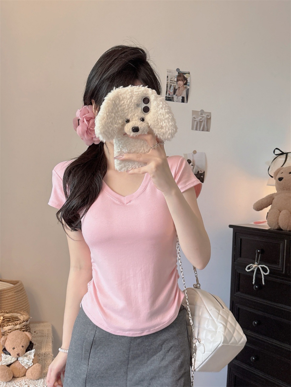 5125 # Чистое желание, V-образный вырез, правое плечо, короткий рукав, футболка для женщин, летний утягивающий дизайн, рюши на талии
