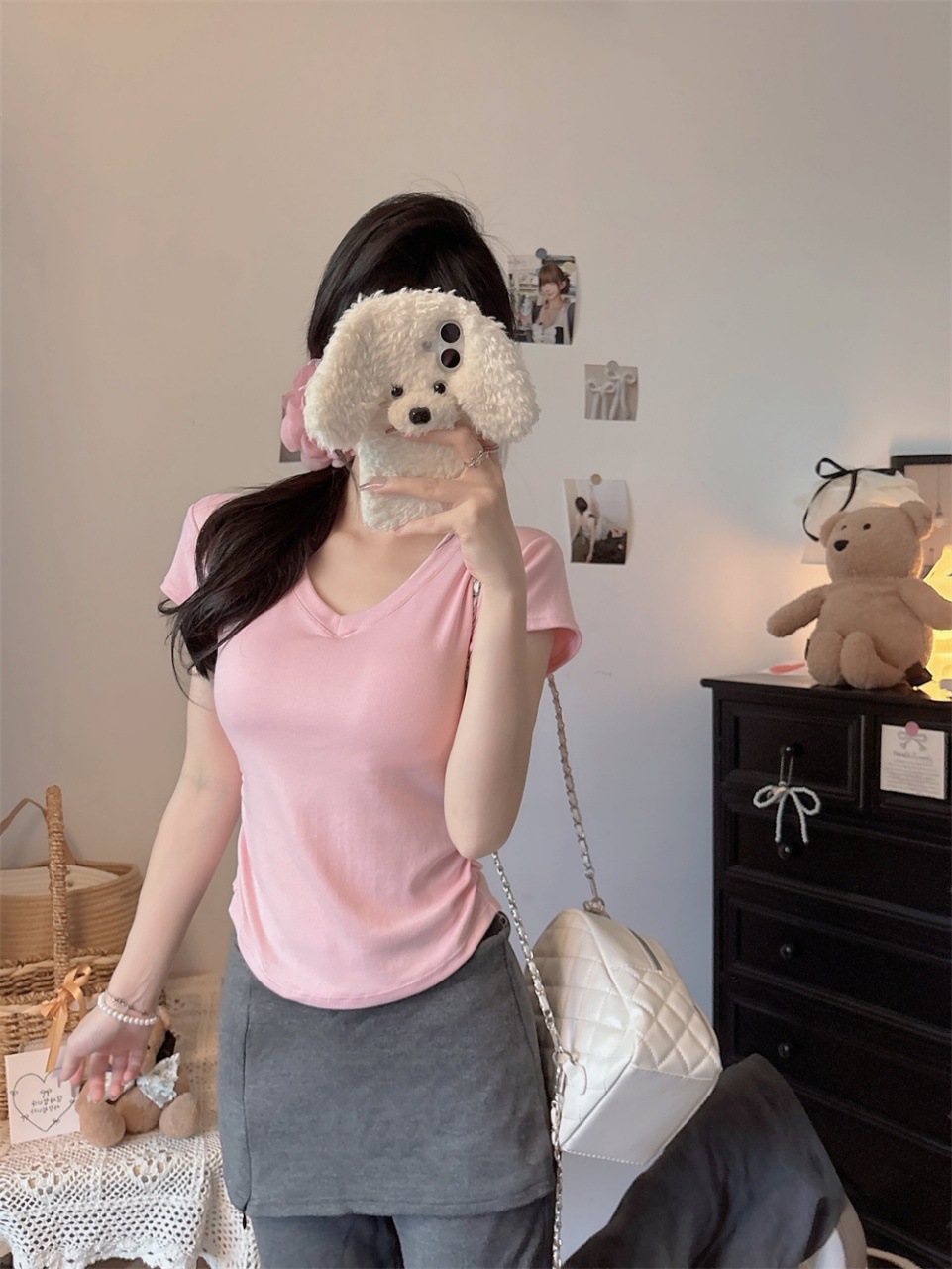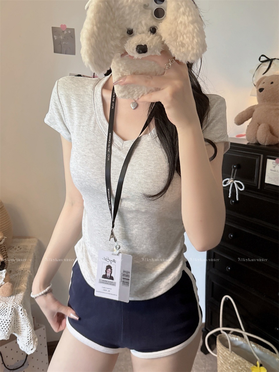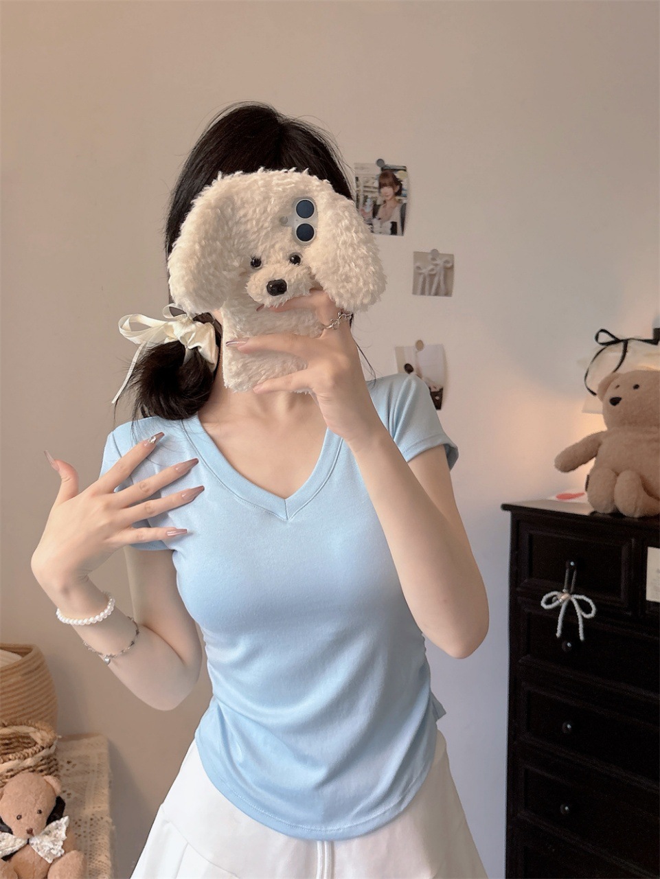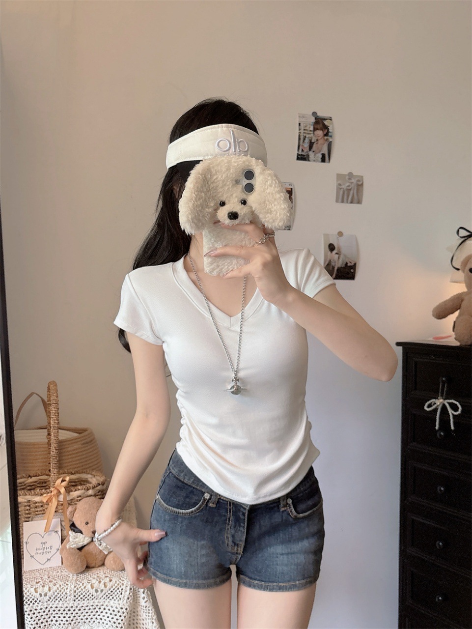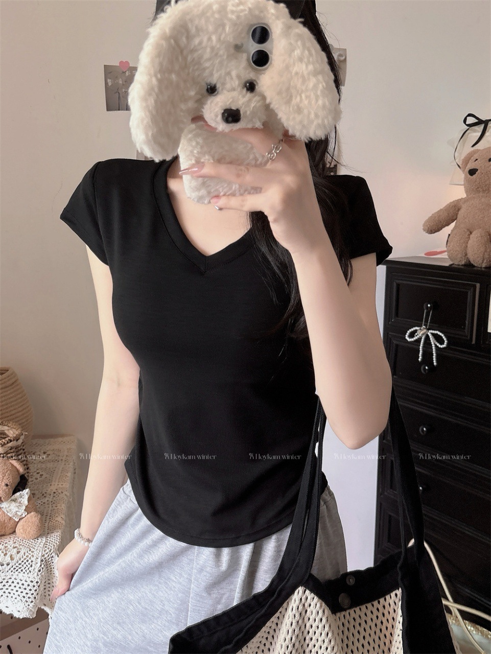 5125 # Чистое желание, V-образный вырез, правое плечо, короткий рукав, футболка для женщин, летний утягивающий дизайн, рюши на талии