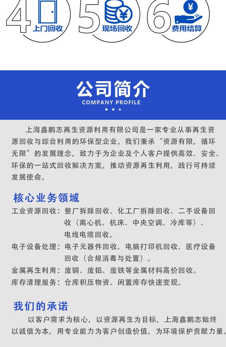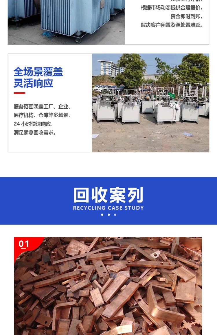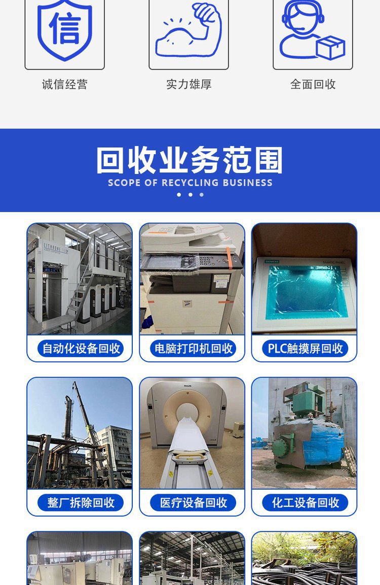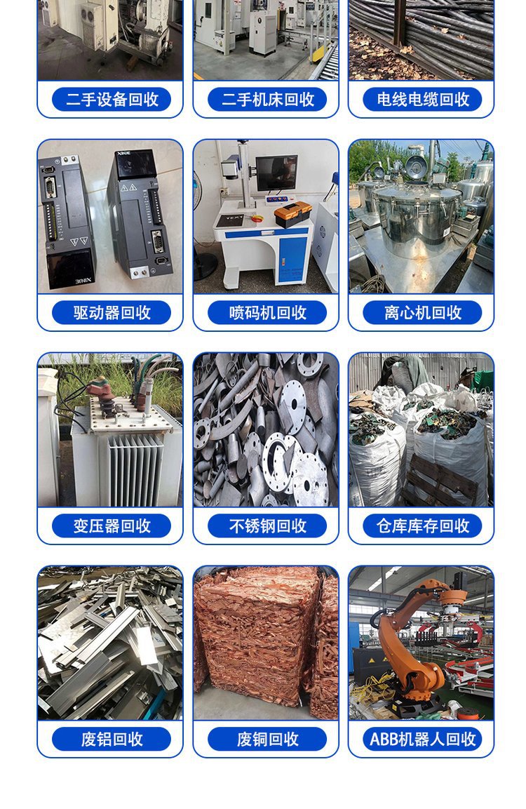 四、电脑回收、变压器、配电柜回收,库存物资回收,电子元件回收,机械废钢回收(冲床)等物资。