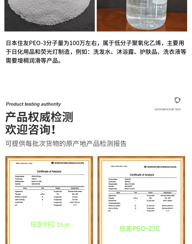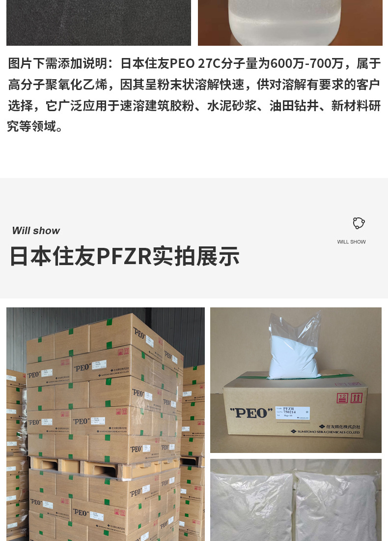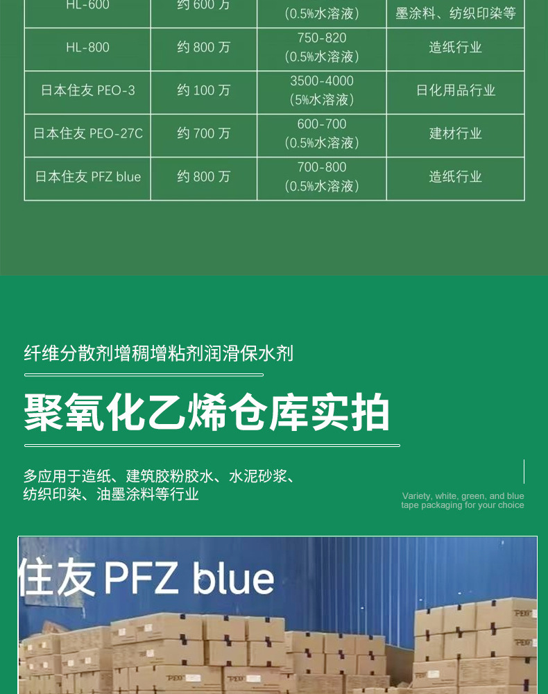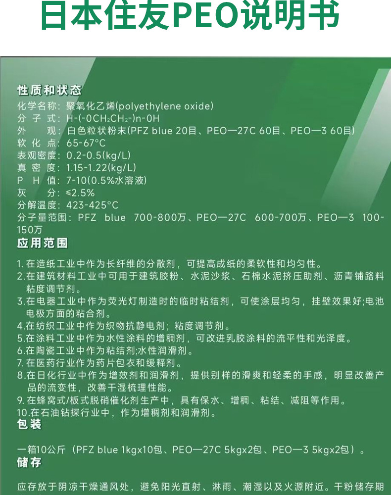 Японский Sumitomo PEO, полиэтиленовый оксид с высоким молекулярным весом, дисперсант для производства бумаги, загуститель для порошка полипропилена, новый продукт