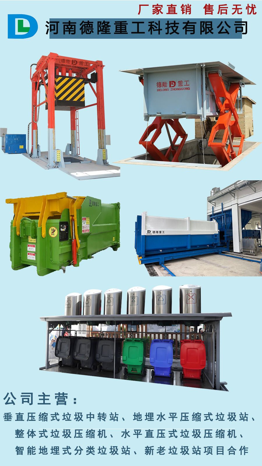 河南德隆重工科技有限公司是一家专注于工程技术研发的环保设备制造商,专业提供生活垃圾处理装备、环境保护设备等,公司主营垃圾中转站常用设施设备,垂直式垃圾压缩中转站、地埋式水平压缩垃圾站、移动式垃圾压缩箱(连体式/一体式/整体式压缩机)、分体式垃圾压缩站水平直压式垃圾压缩机、智能地埋升降式垃圾桶,主要用于对城市、乡镇的生活垃圾压缩减容的作用。在小区、村庄、厂矿、公园、景区、街道边、院校等区域,有效的提高周边居民生活垃圾以及固体废弃物的收集、压缩减容和封闭转运。