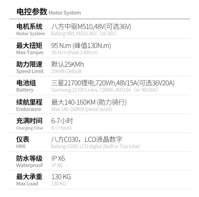 【电池组】:三星21700锂电,720Wh,48V15A(可选36V20A),铝合金外壳