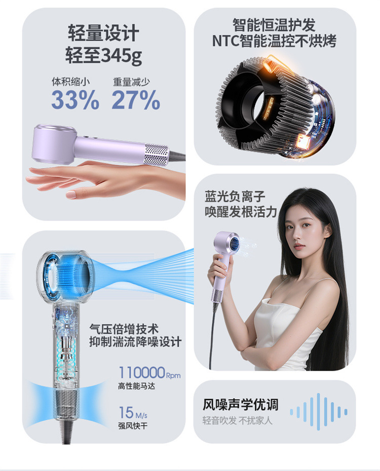 Фен для дома с негативными ионами, бесшумный, быстро сохнет, безлопастной, мощный
