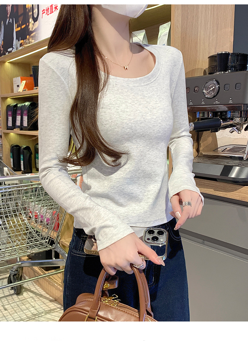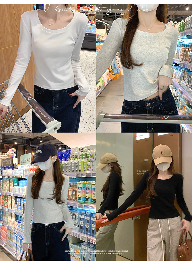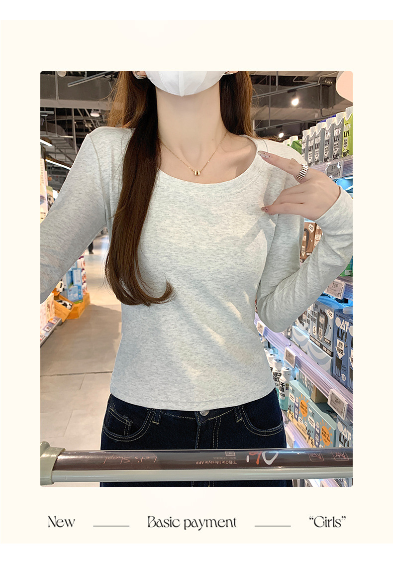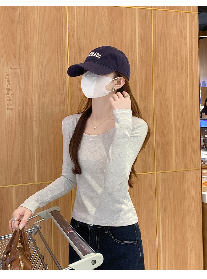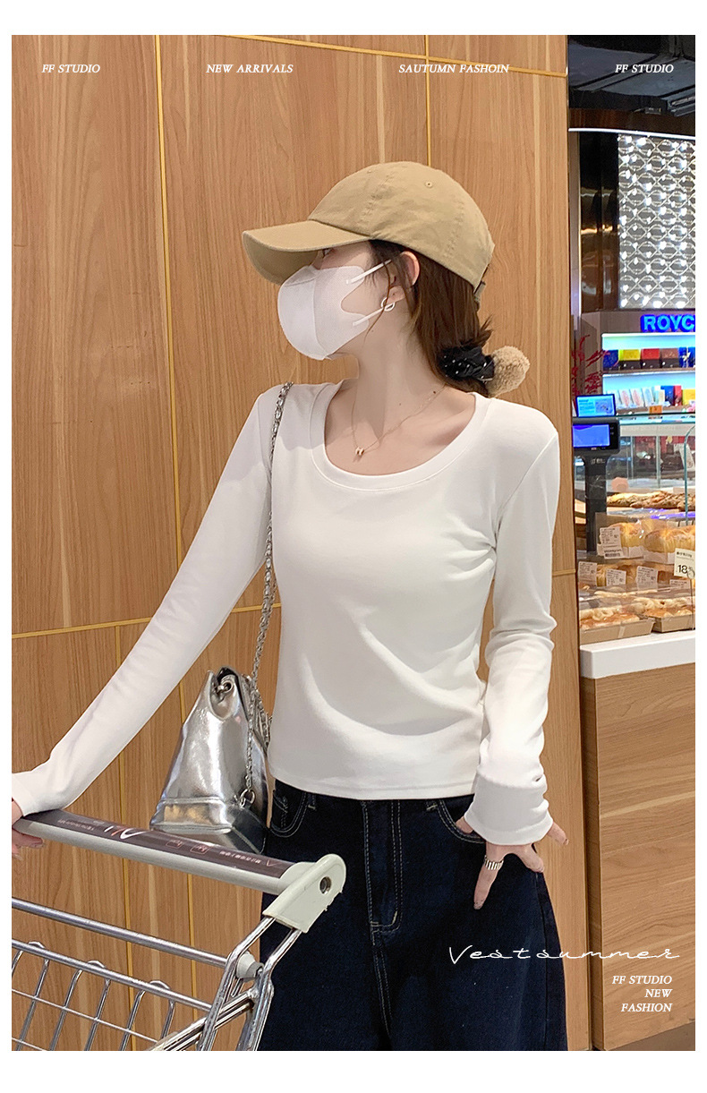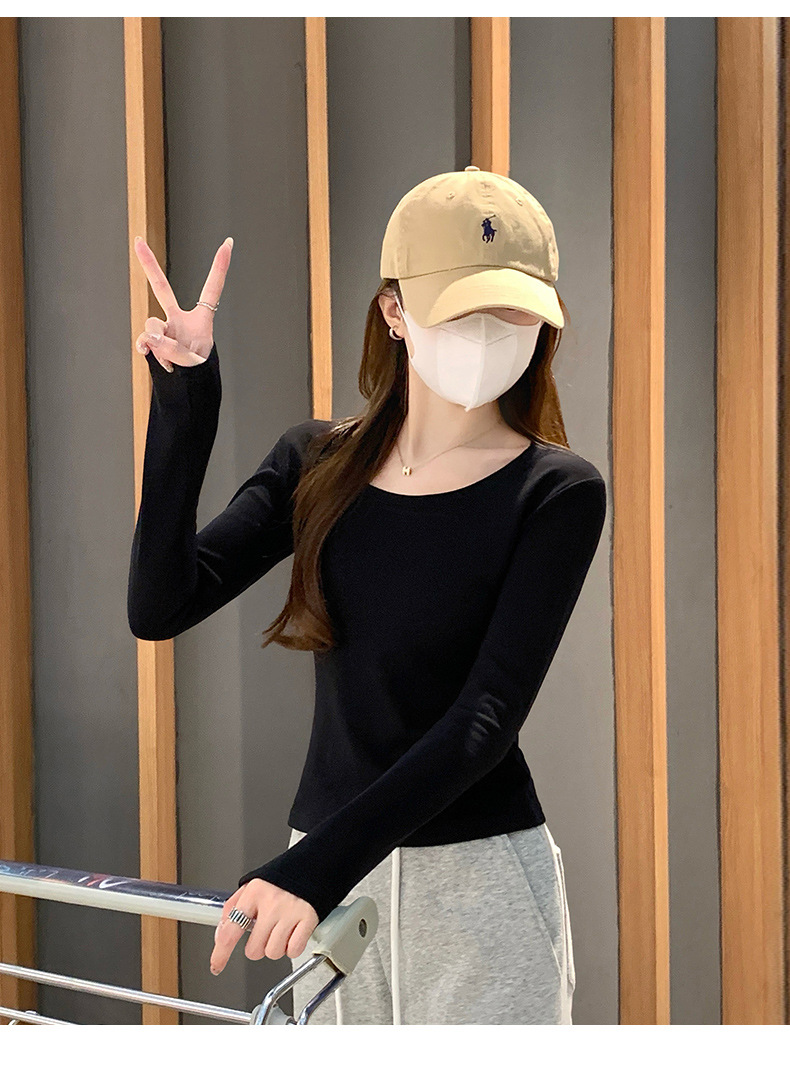 Футболка с длинным рукавом из 95% хлопка для женщин, стандартные плечи, U-образный вырез, облегающий, простой однотонный цвет