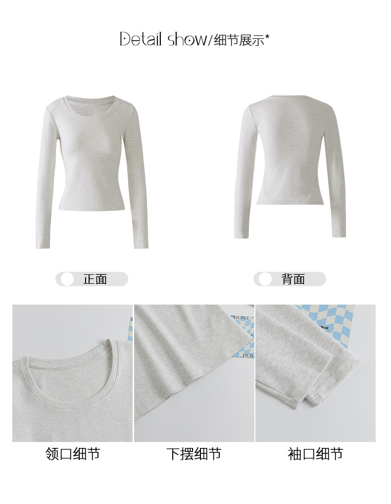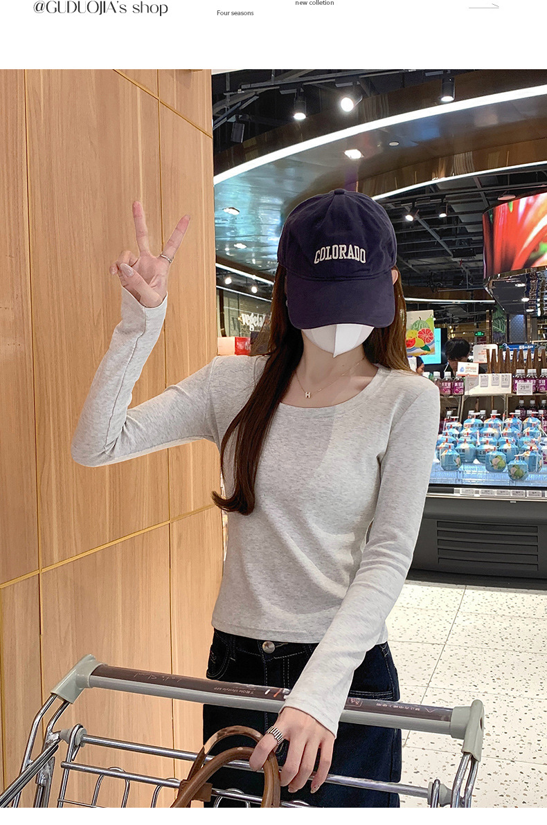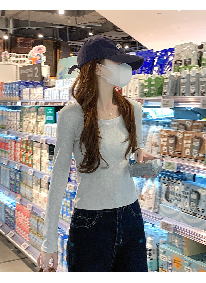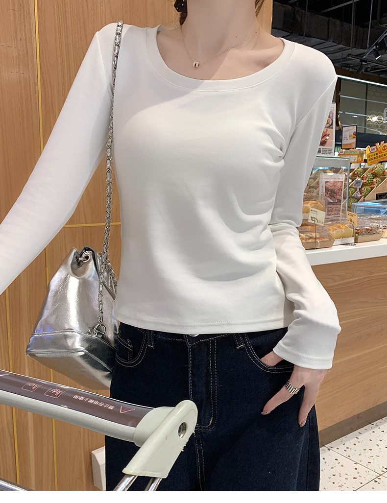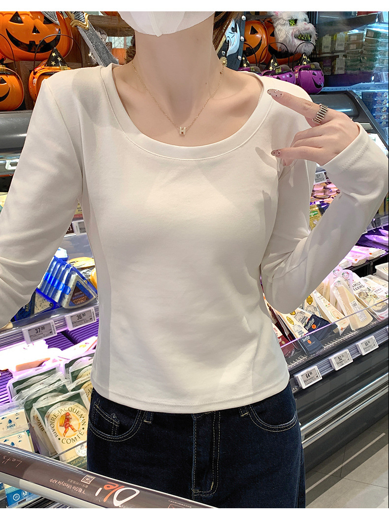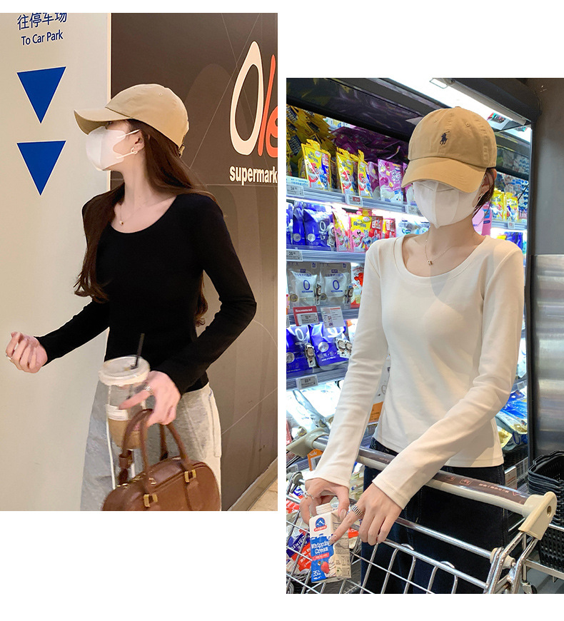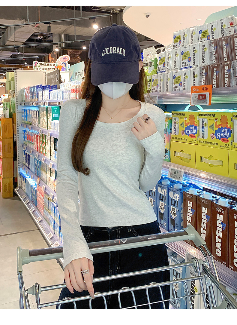 Футболка с длинным рукавом из 95% хлопка для женщин, стандартные плечи, U-образный вырез, облегающий, простой однотонный цвет