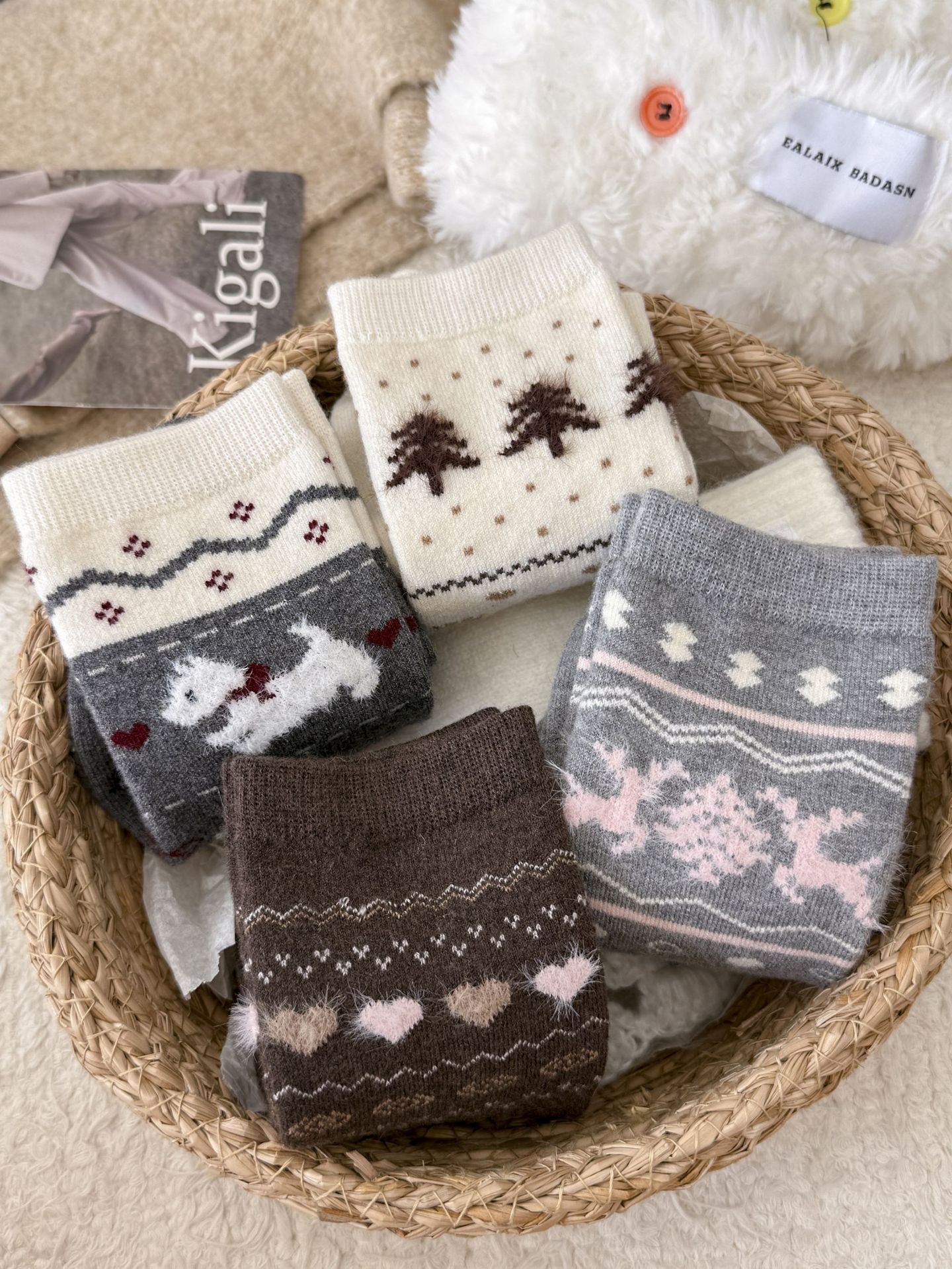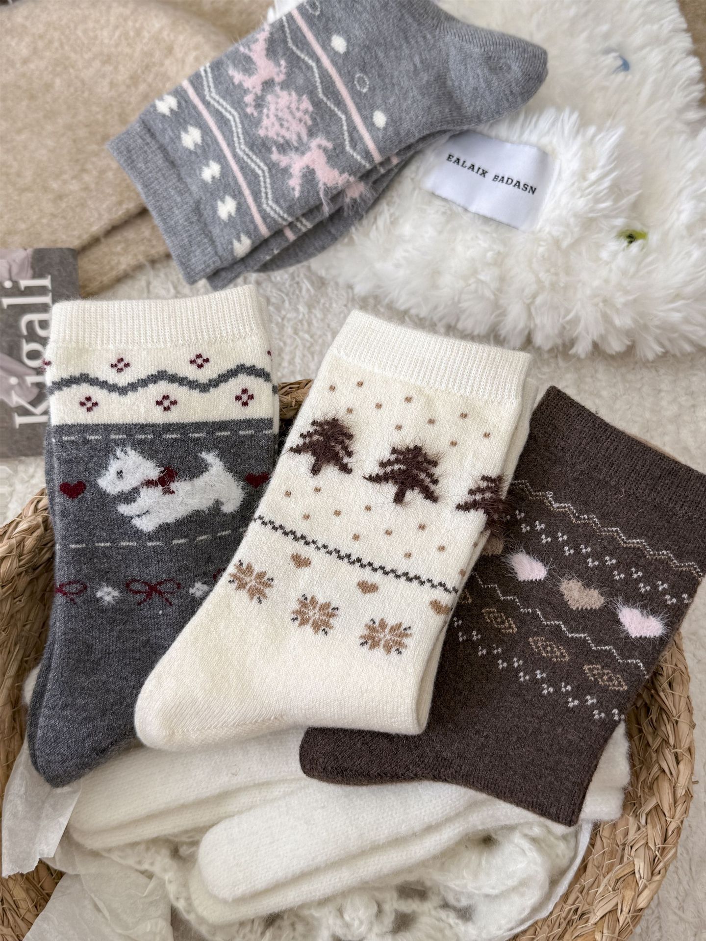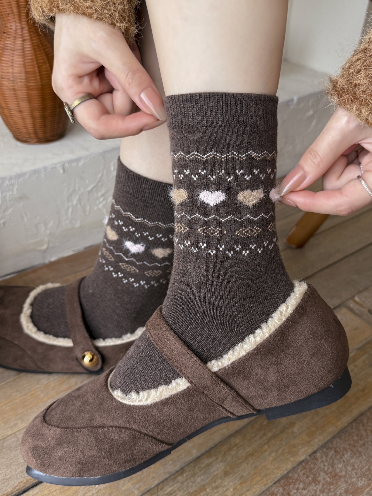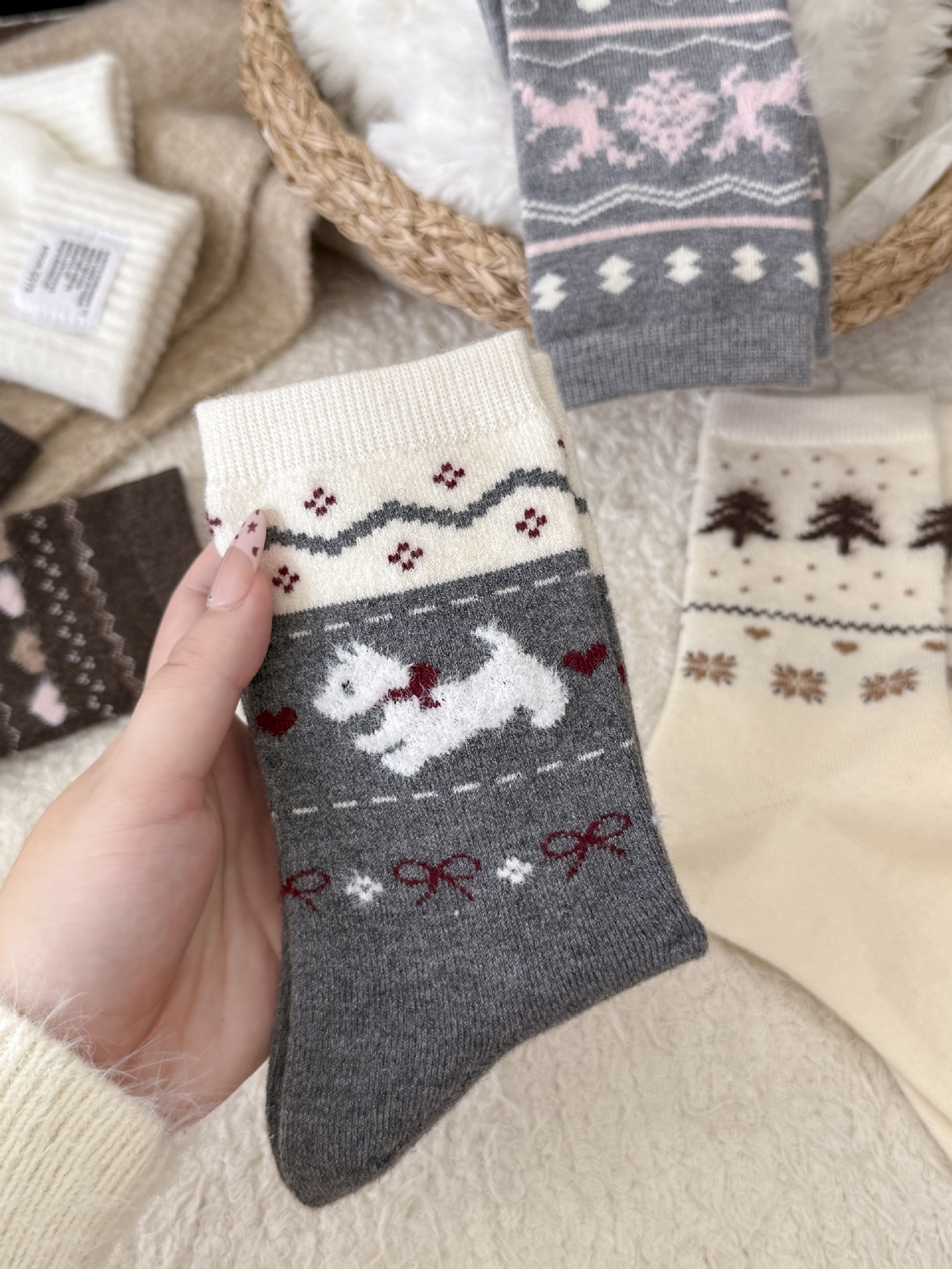 Утолщенные теплые носки в стиле Fair Isle для женщин, ретро носки с сердечком и щенком, носки средней длины для студентов