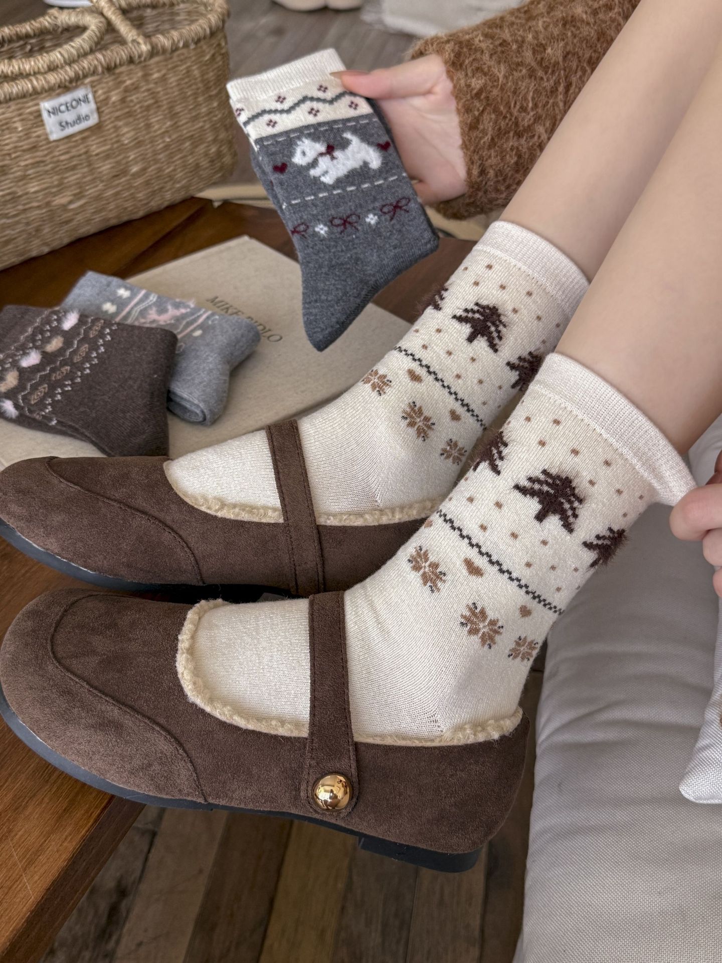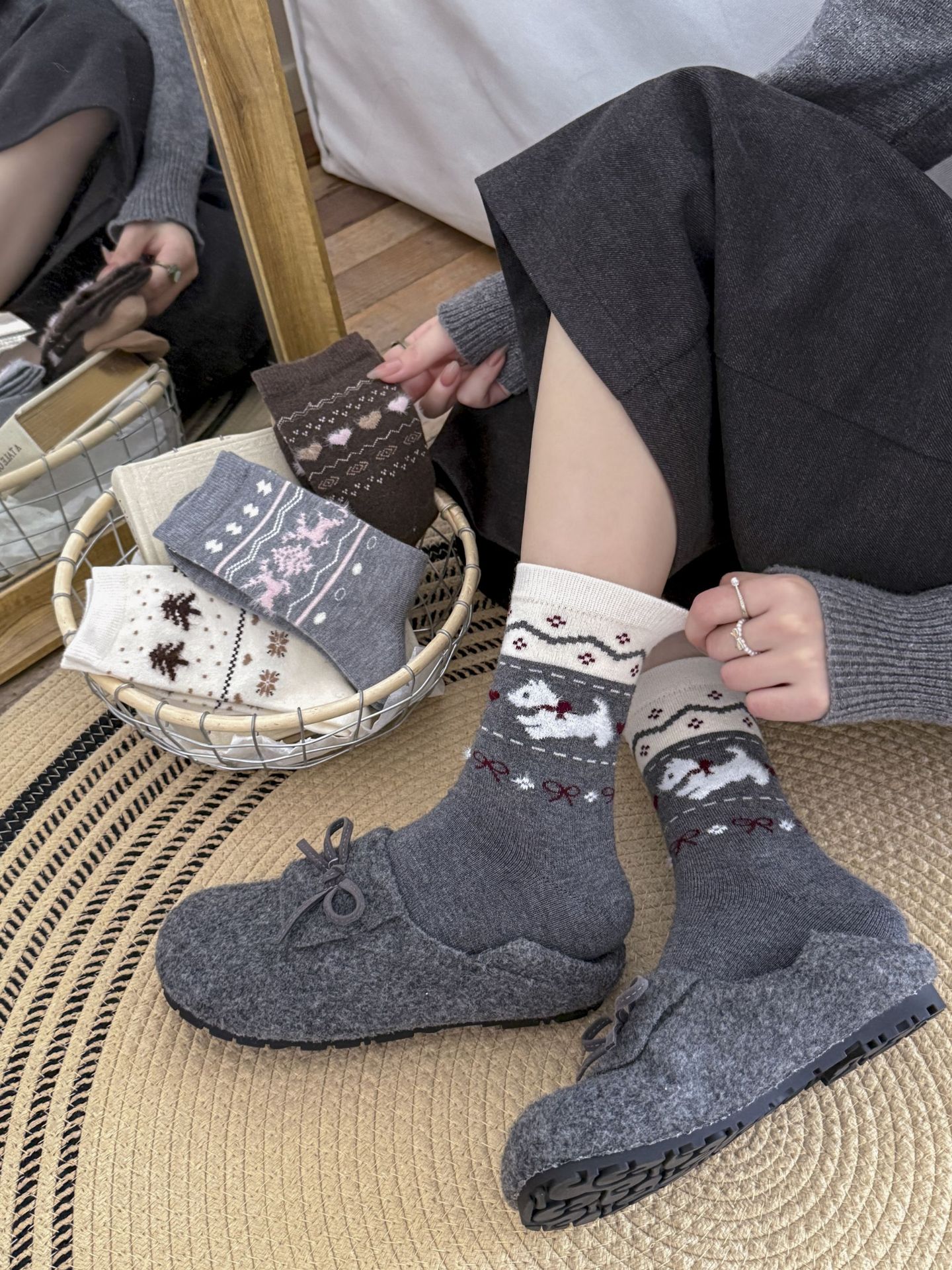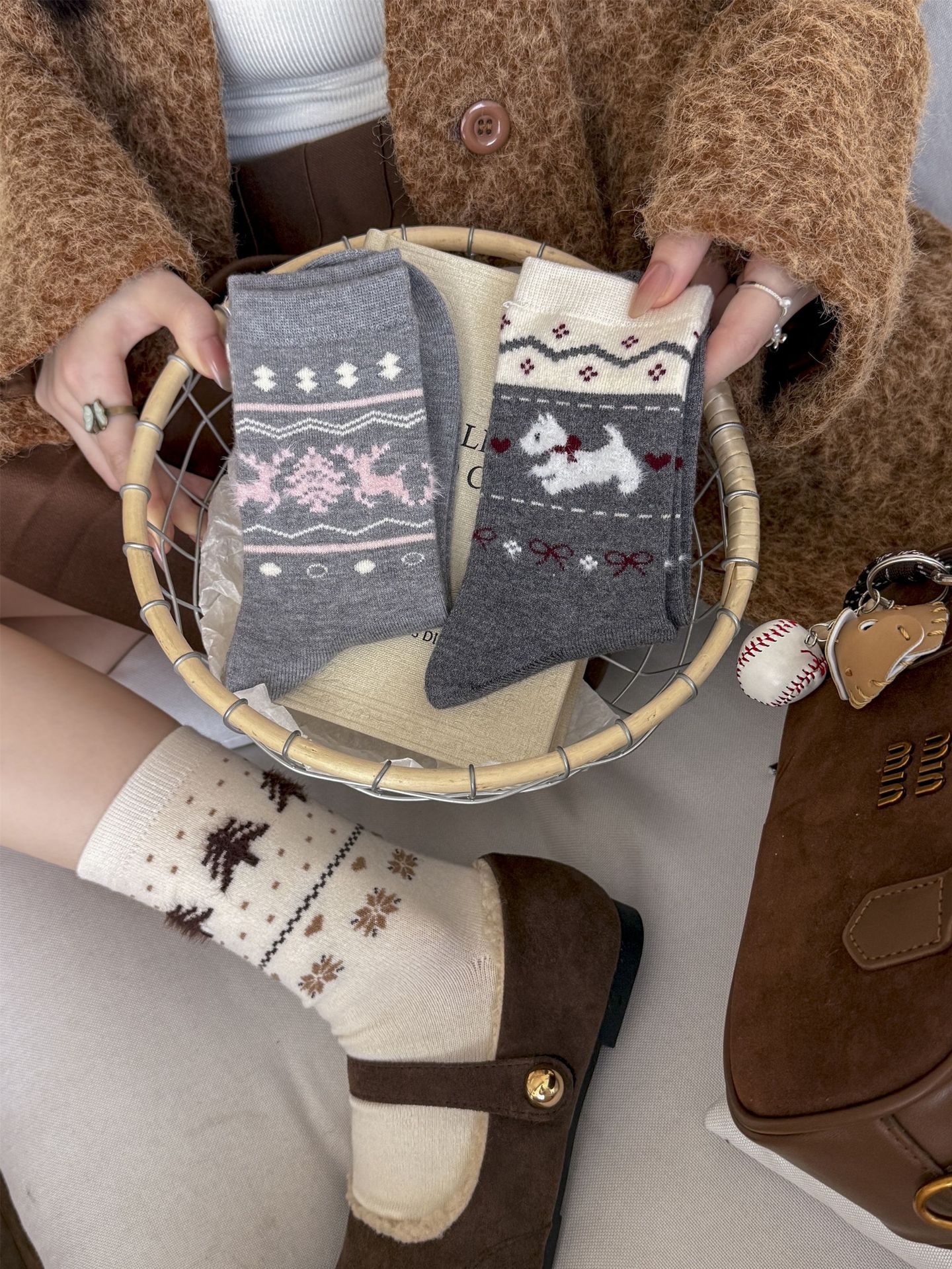 Утолщенные теплые носки в стиле Fair Isle для женщин, ретро носки с сердечком и щенком, носки средней длины для студентов