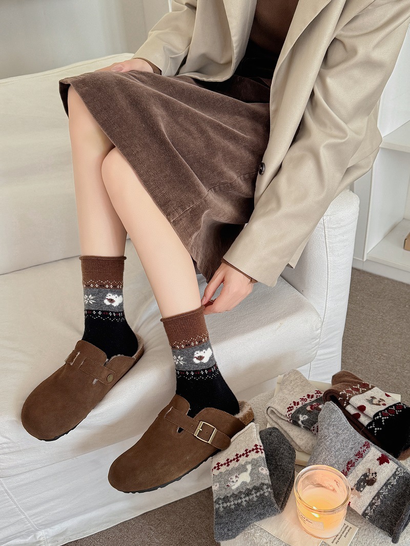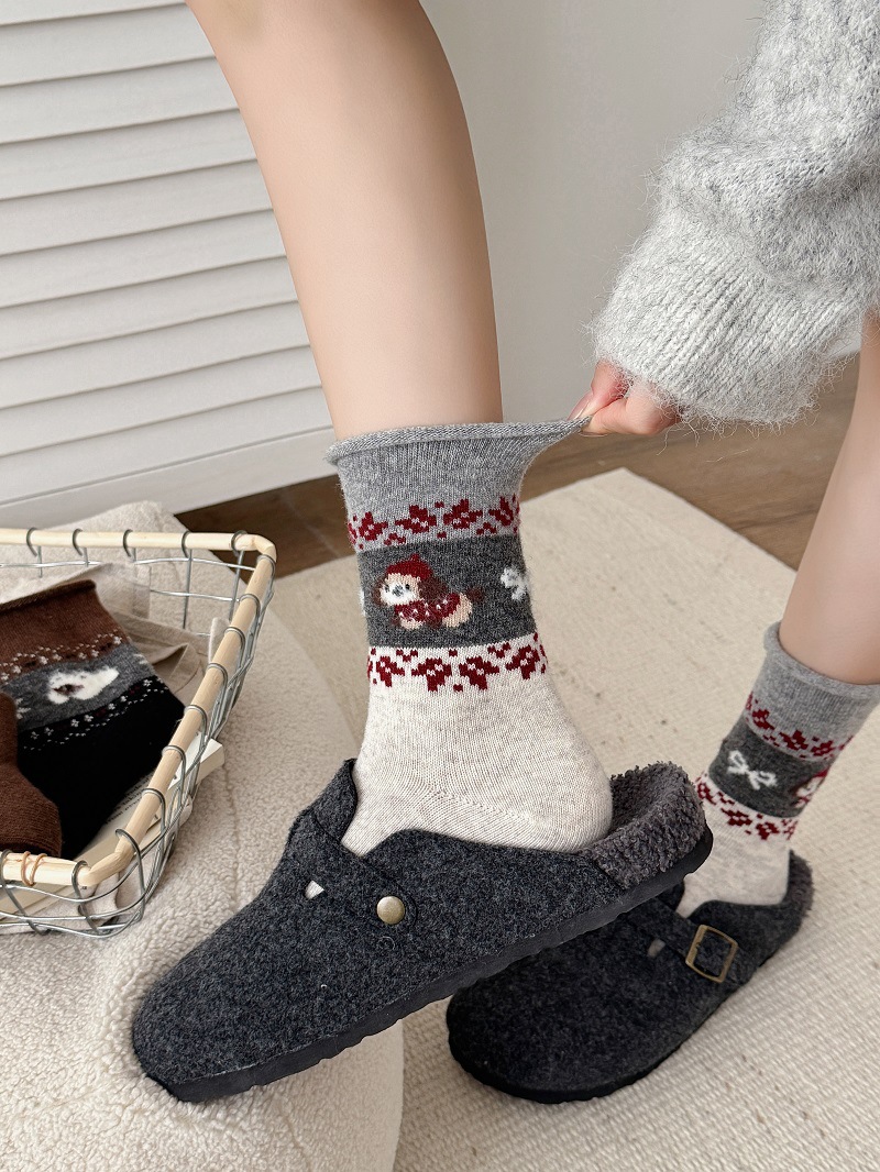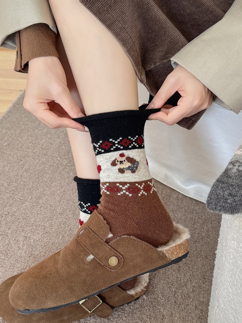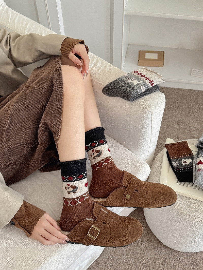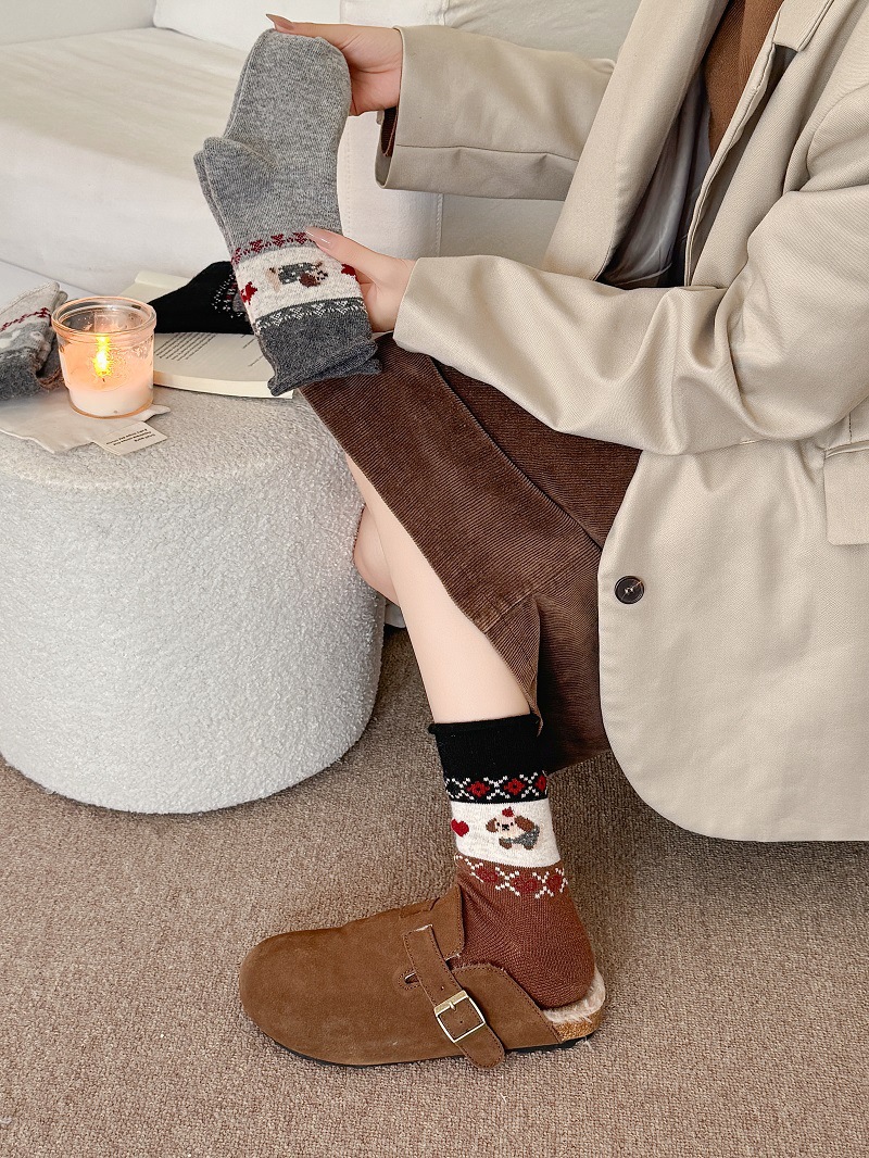 Носки из шерсти с рисунком Fair Isle для женщин, утолщенные теплые носки с флоком в японском ретро стиле с изображением щенка