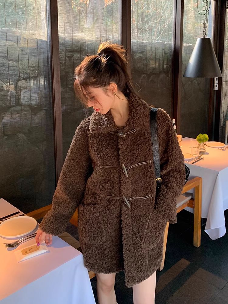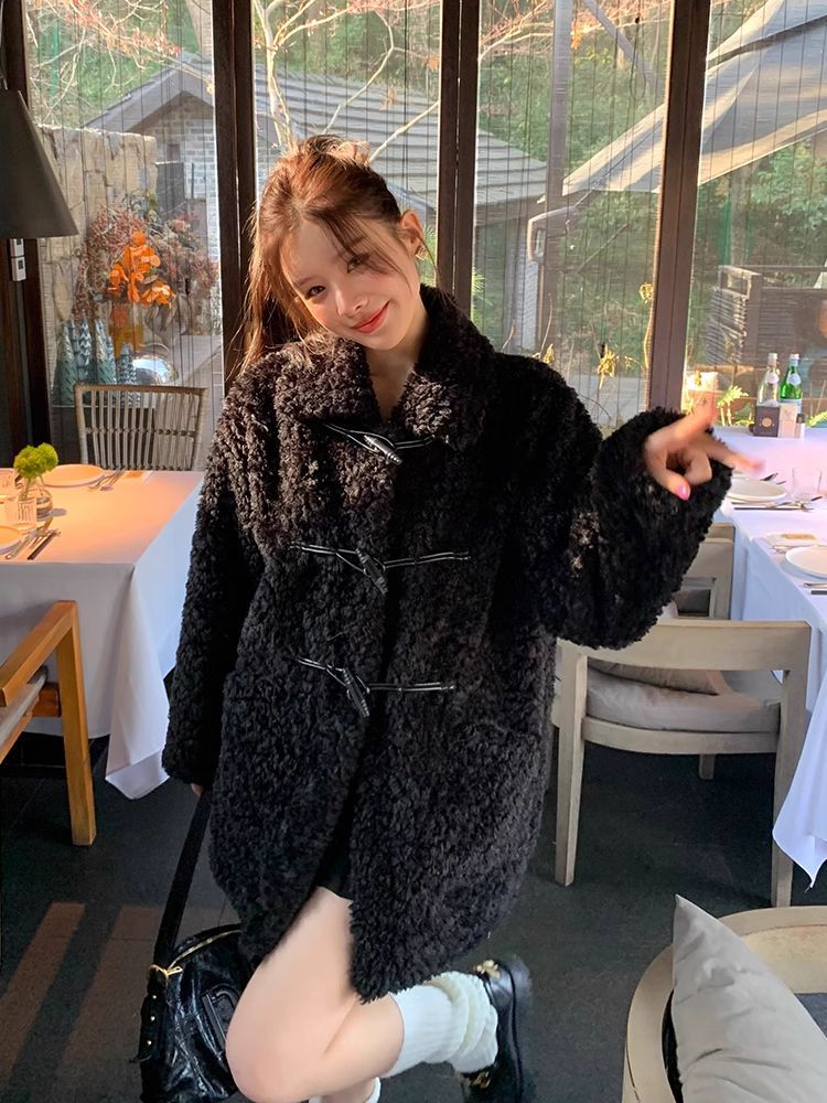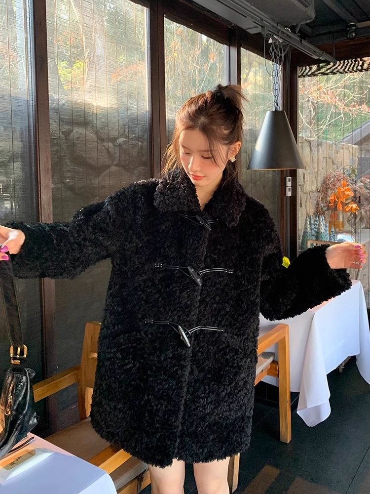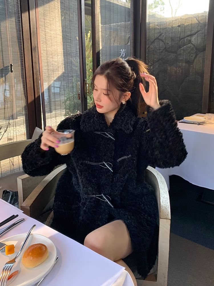 Имитация овечьего меха 2025 Новый осенне-зимний женский пальто с роговыми пуговицами, средней длины, черное, теплое